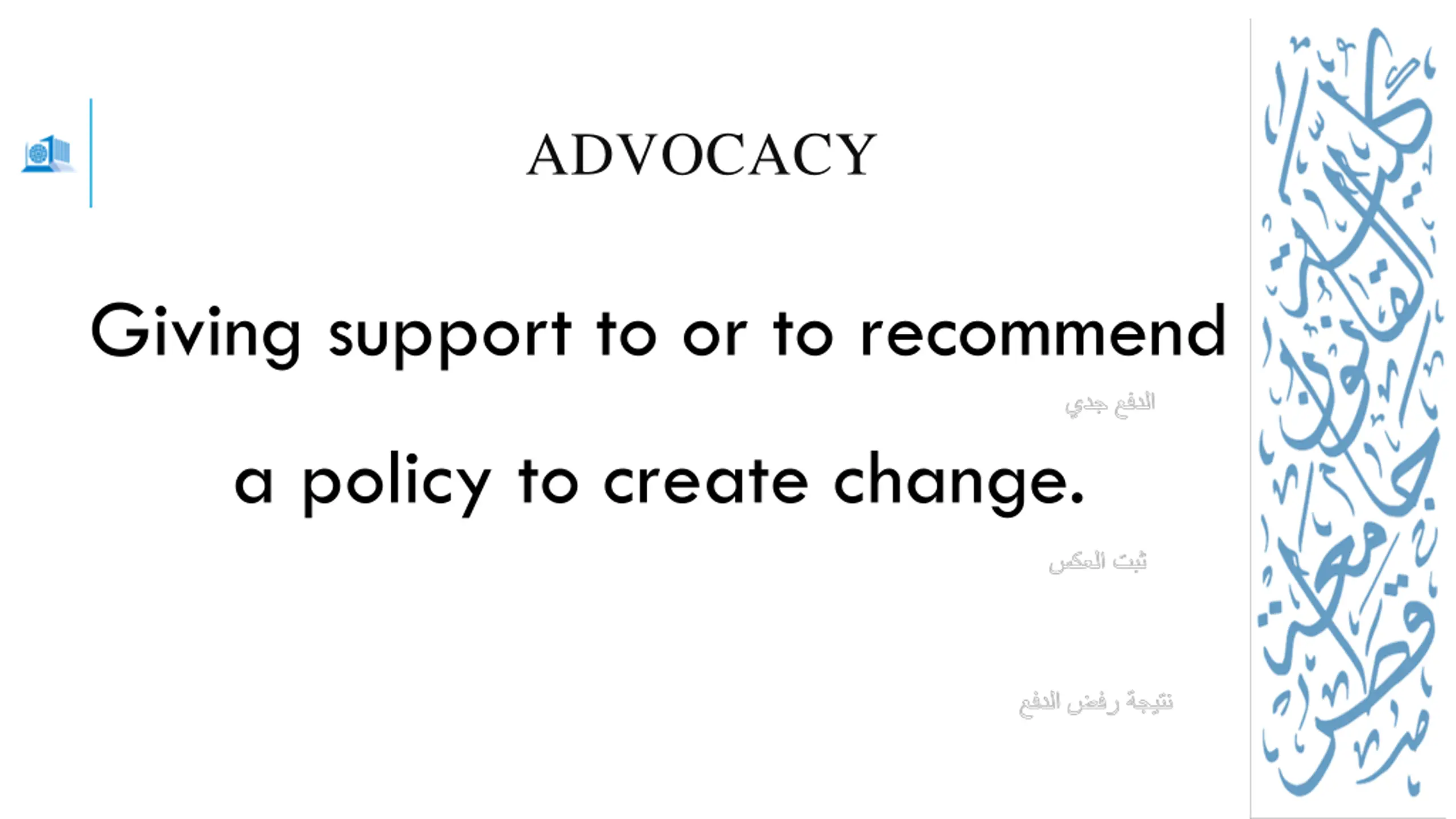 ADVOCACY Giving support to or to recommend a policy to create change.