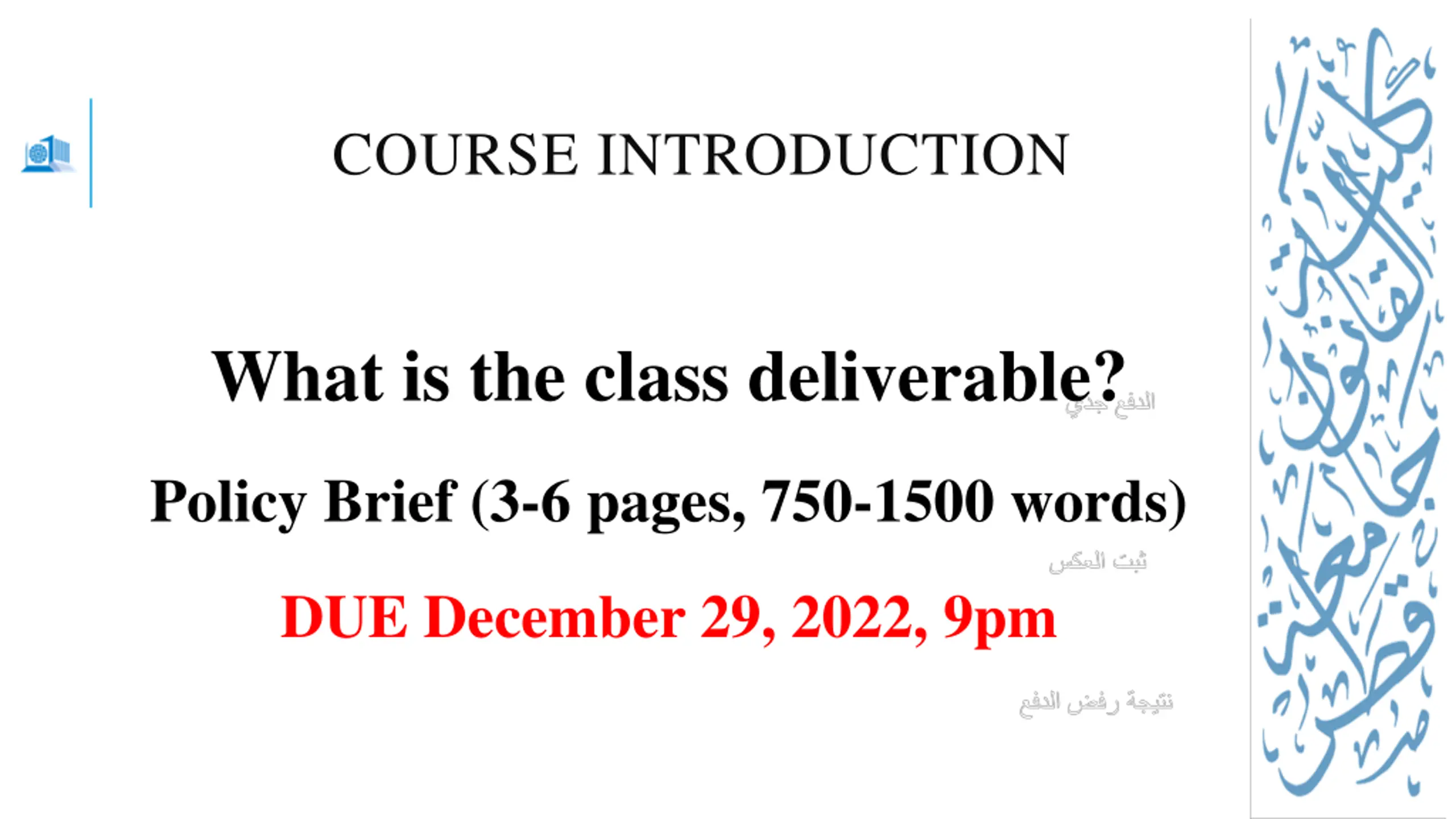 COURSE INTRODUCTION What is the class deliverable? Policy Brief (3-6 pages, 750-1500 words) DUE December 29, 2022, 9pm
