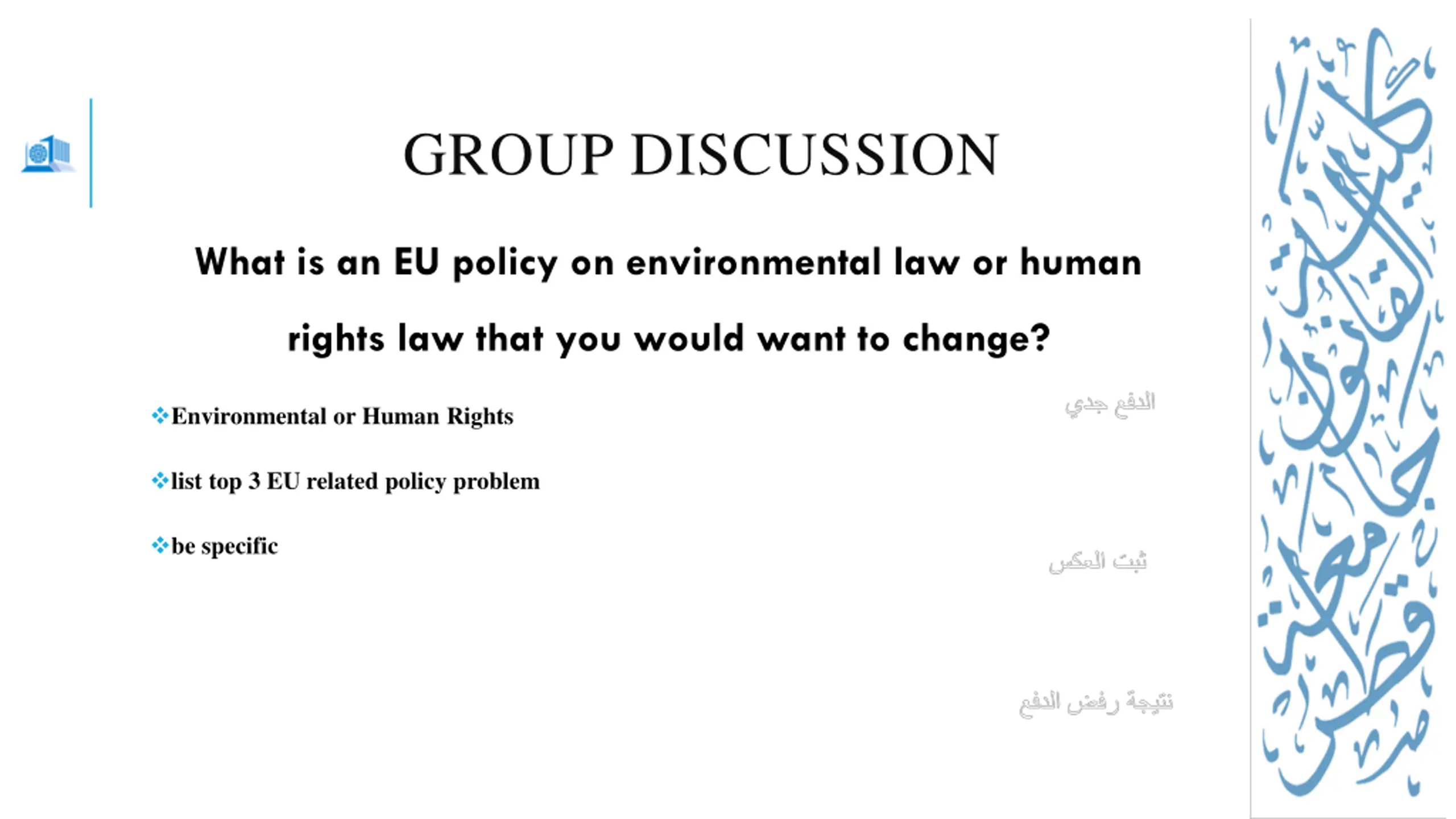 GROUP DISCUSSION What is an EU policy on environmental law or human rights law that you would want to change? Environmental or Human Rights list top 3 EU related policy problem be specific