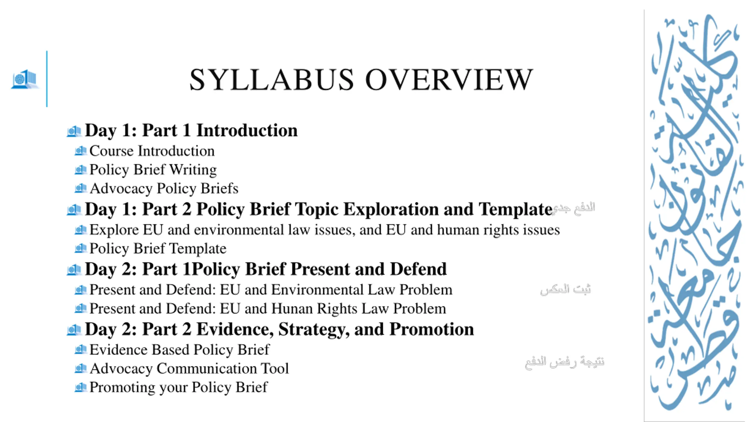SYLLABUS OVERVIEW Day 1: Part 1 Introduction Course Introduction Policy Brief Writing Advocacy Policy Briefs Day 1: Part 2 Policy Brief Topic Exploration and Template Explore EU and environmental law issues, and EU and human rights issues Policy Brief Template Day 2: Part 1Policy Brief Present and Defend Present and Defend: EU and Environmental Law Problem Present and Defend: EU and Hunan Rights Law Problem Day 2: Part 2 Evidence, Strategy, and Promotion Evidence Based Policy Brief Advocacy Communication Tool Promoting your Policy Brief