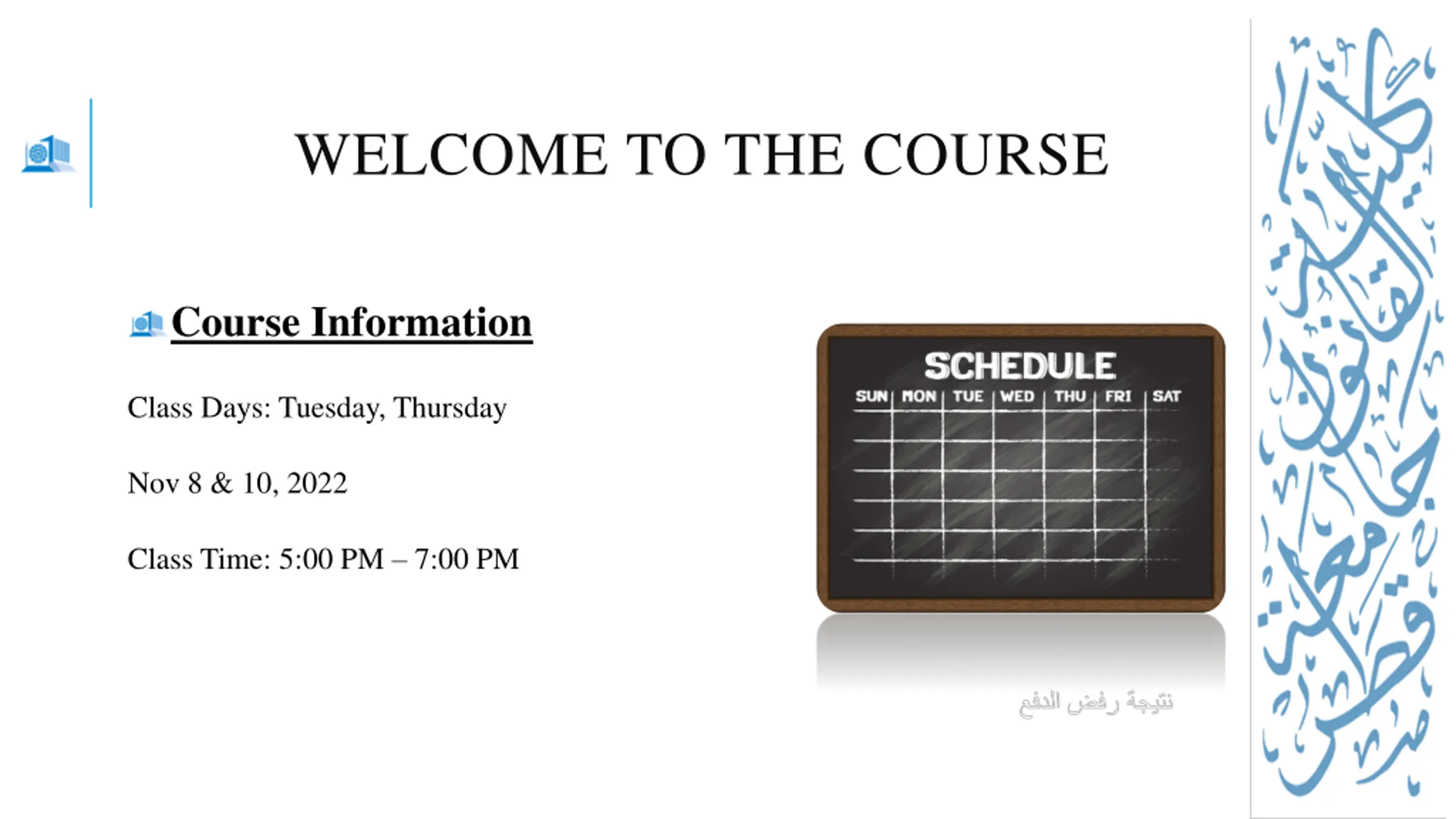 WELCOME TO THE COURSE Course Information Class Days: Tuesday, Thursday Nov 8 & 10, 2022 Class Time: 5:00 PM 7:00 PM