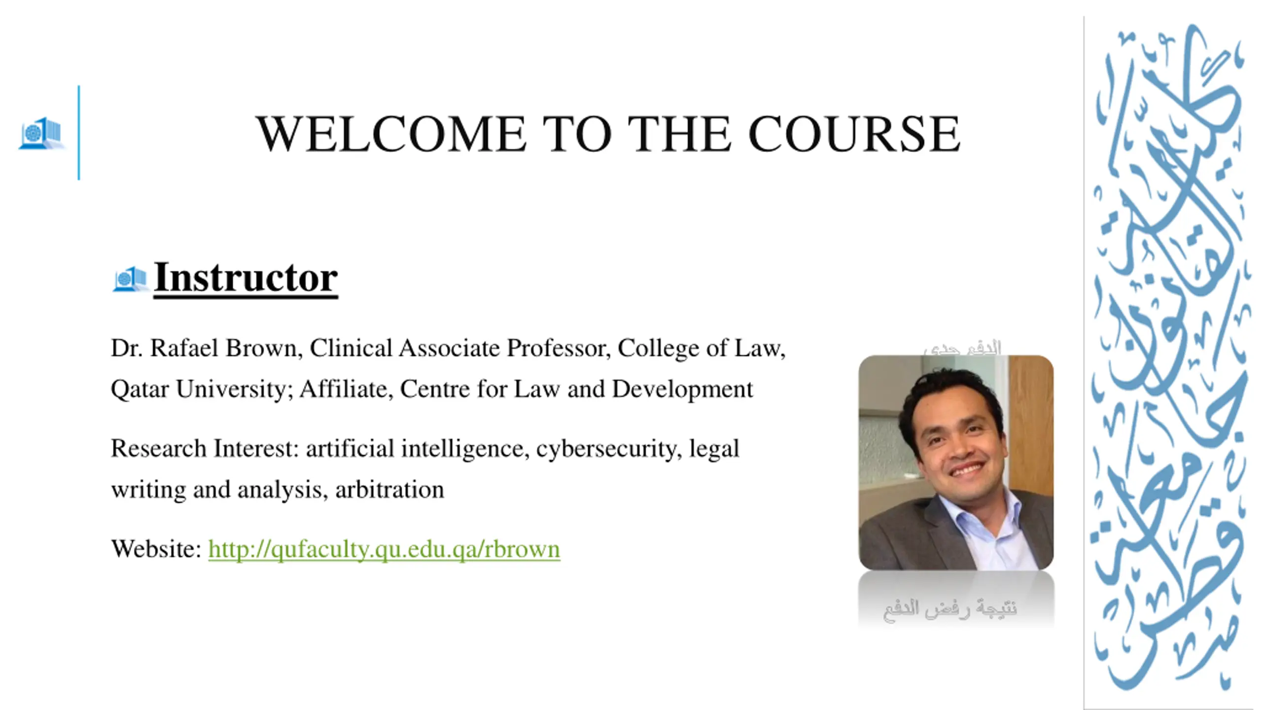 WELCOME TO THE COURSE Instructor Dr. Rafael Brown, Clinical Associate Professor, College of Law, Qatar University; Affiliate, Centre for Law and Development Research Interest: artificial intelligence, cybersecurity, legal writing and analysis, arbitration Website: http://qufaculty.qu.edu.qa/rbrown
