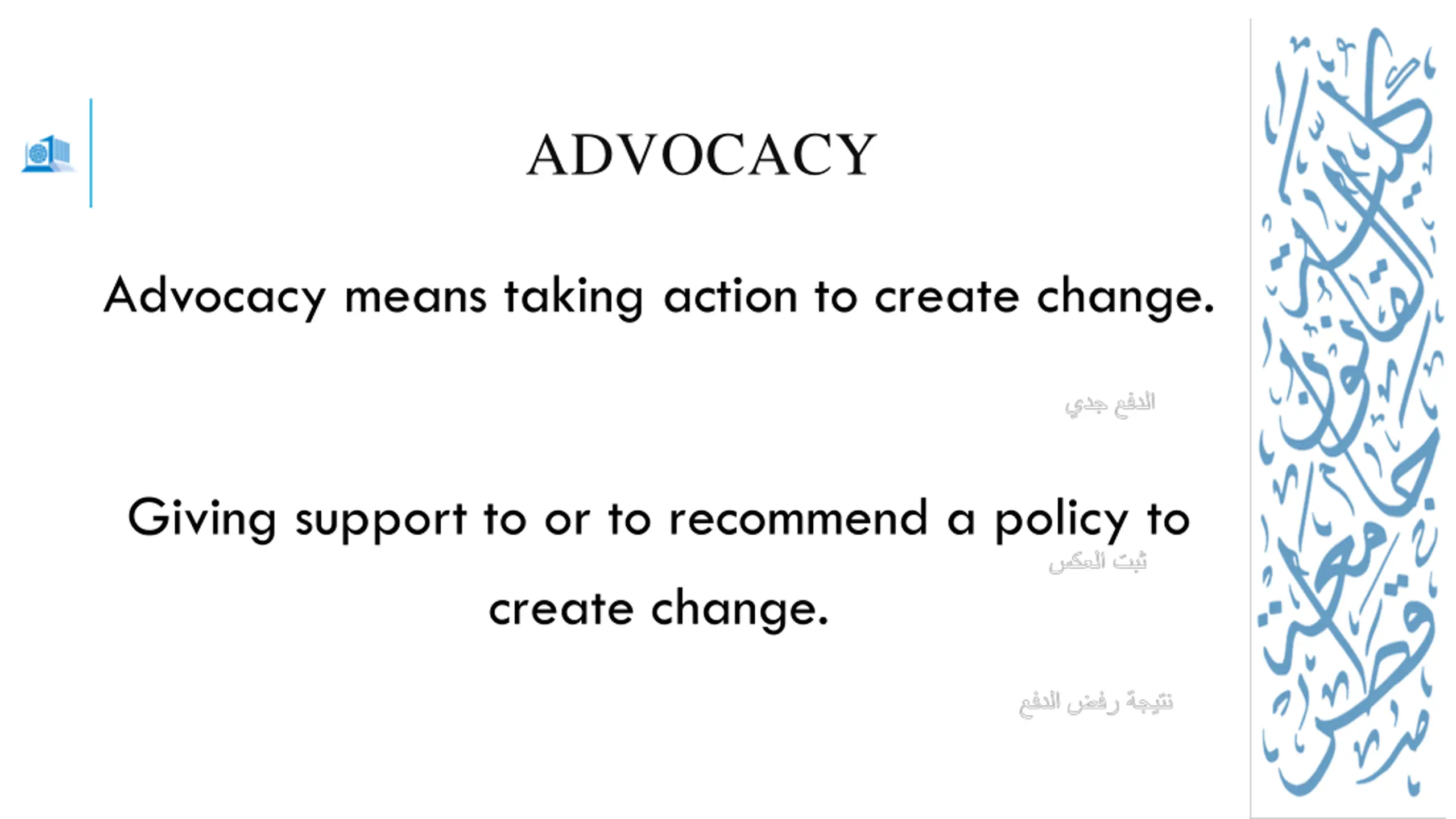 ADVOCACY Advocacy means taking action to create change. Giving support to or to recommend a policy to create change.