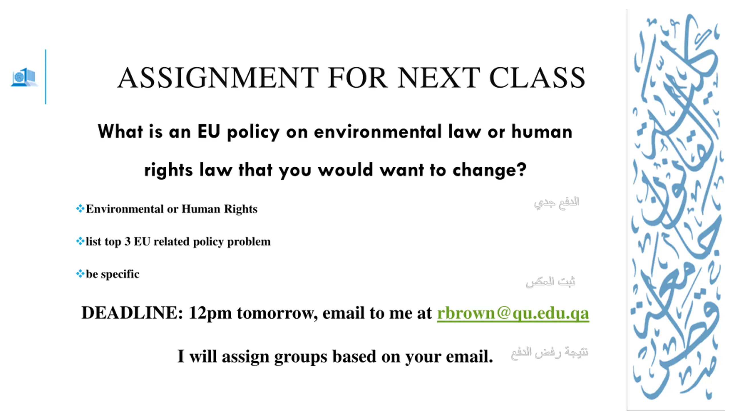 ASSIGNMENT FOR NEXT CLASS What is an EU policy on environmental law or human rights law that you would want to change? Environmental or Human Rights list top 3 EU related policy problem be specific DEADLINE: 12pm tomorrow, email to me at rbrown@qu.edu.qa I will assign groups based on your email.