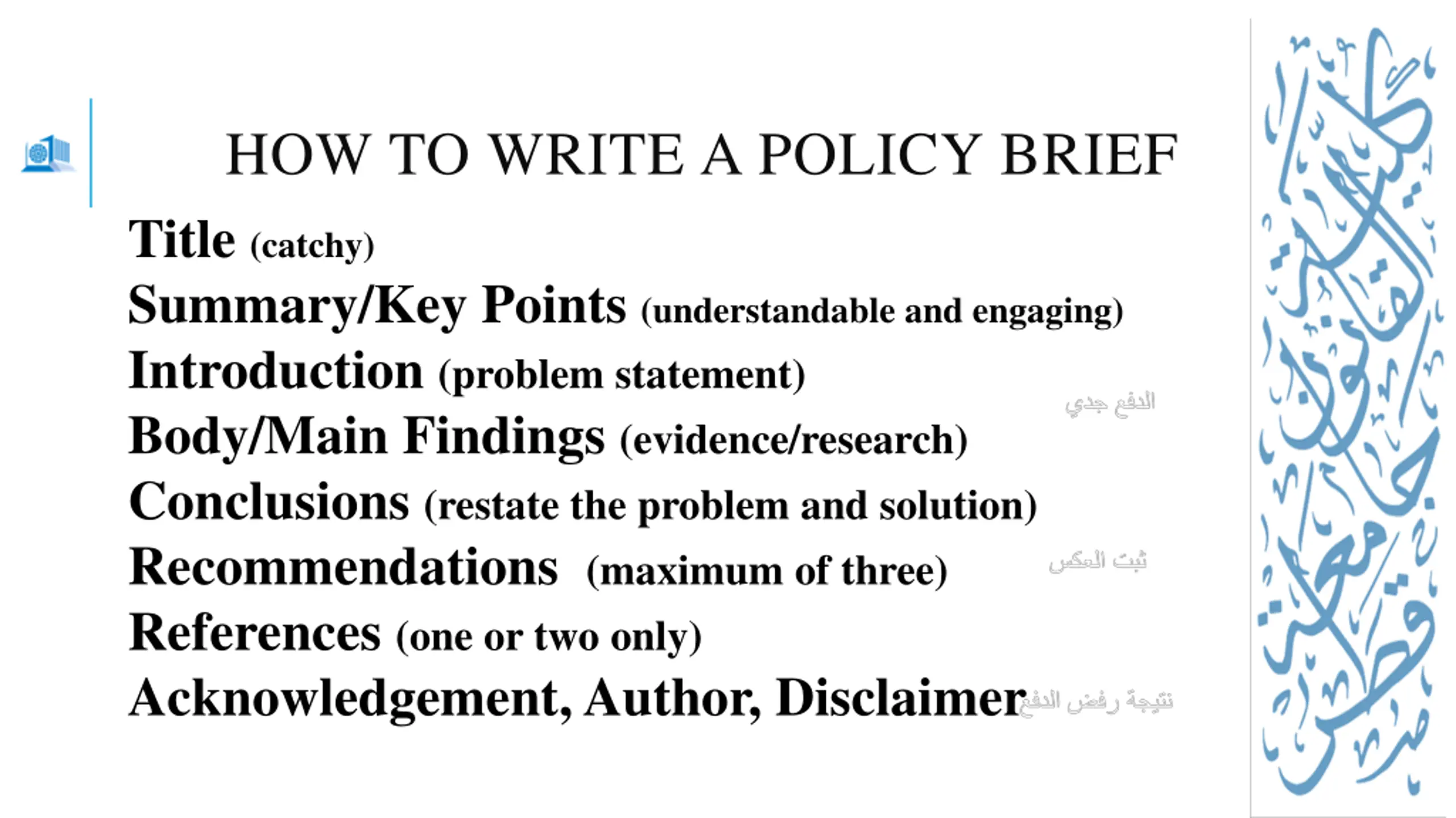HOW TO WRITE A POLICY BRIEF Title (catchy) Summary/Key Points (understandable and engaging) Introduction (problem statement) Body/Main Findings (evidence/research) Conclusions (restate the problem and solution) Recommendations (maximum of three) References (one or two only) Acknowledgement, Author, Disclaimer