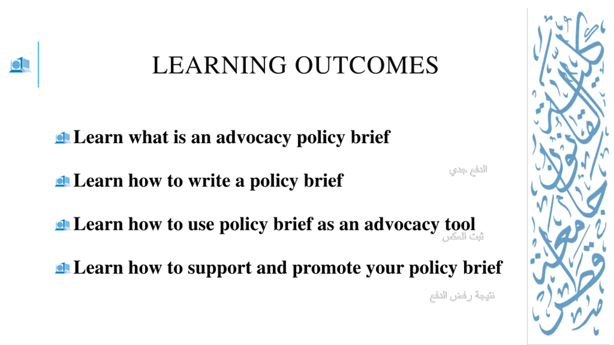LEARNING OUTCOMES Learn what is an advocacy policy brief Learn how to write a policy brief Learn how to use policy brief as an advocacy tool Learn how to support and promote your policy brief