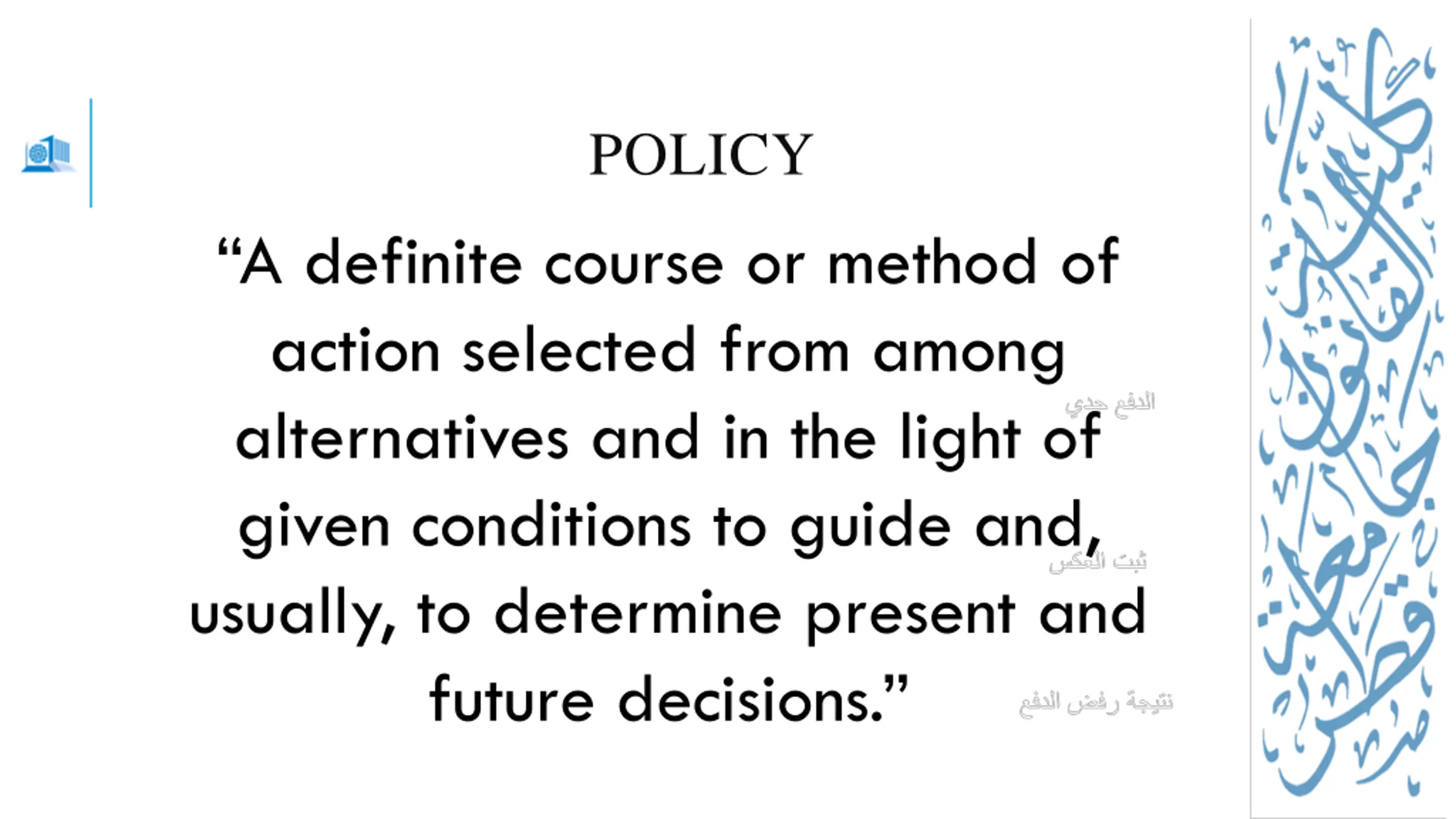POLICY A definite course or method of action selected from among alternatives and in the light of given conditions to guide and, usually, to determine present and future decisions.