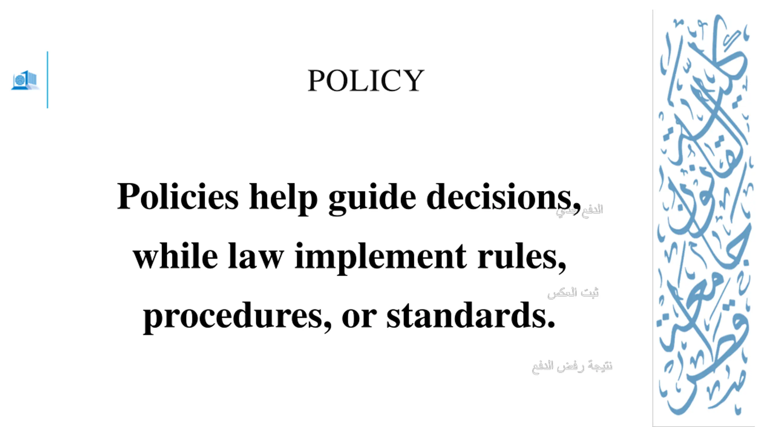 POLICY Policies help guide decisions, while law implement rules, procedures, or standards.