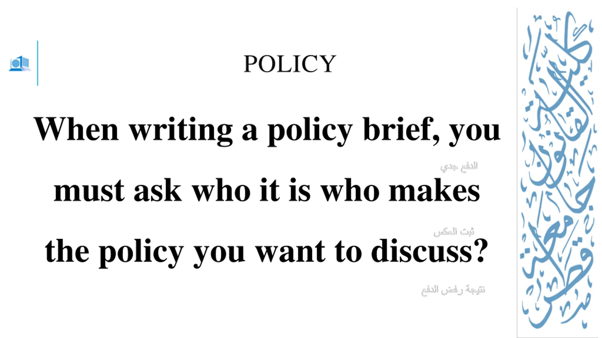 POLICY When writing a policy brief, you must ask who it is who makes the policy you want to discuss?
