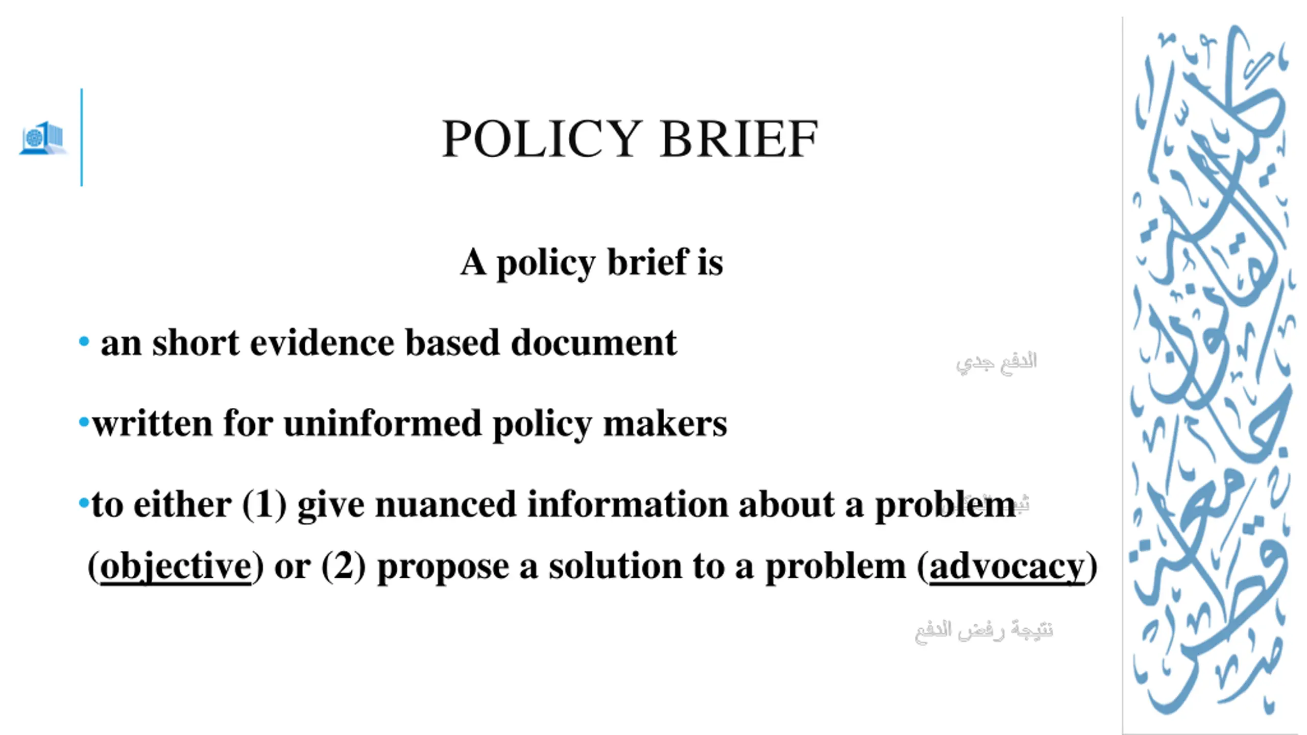 POLICY BRIEF A policy brief is an short evidence based document written for uninformed policy makers to either (1) give nuanced information about a problem (objective) or (2) propose a solution to a problem (advocacy)