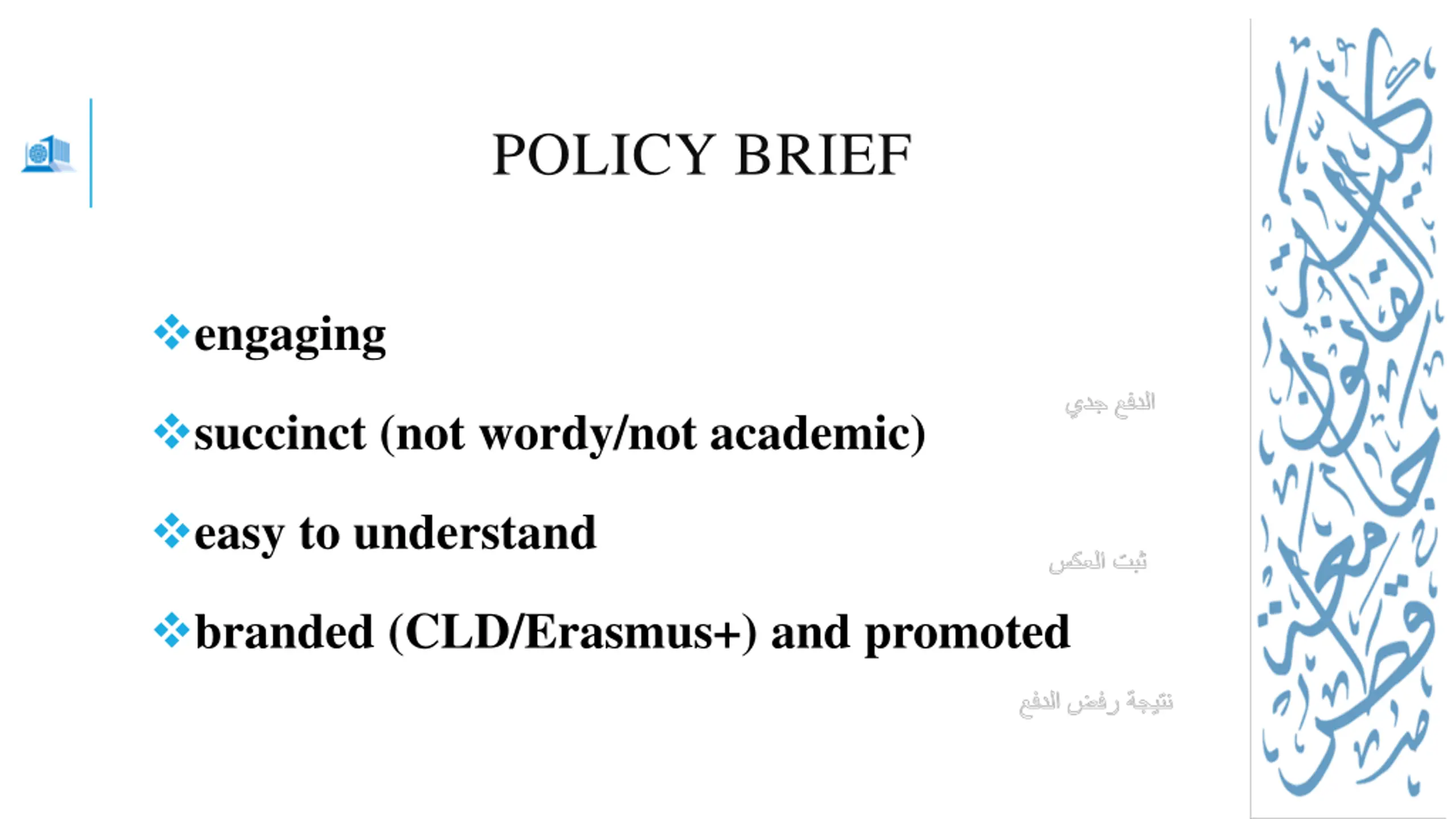POLICY BRIEF engaging succinct (not wordy/not academic) easy to understand branded (CLD/Erasmus+) and promoted