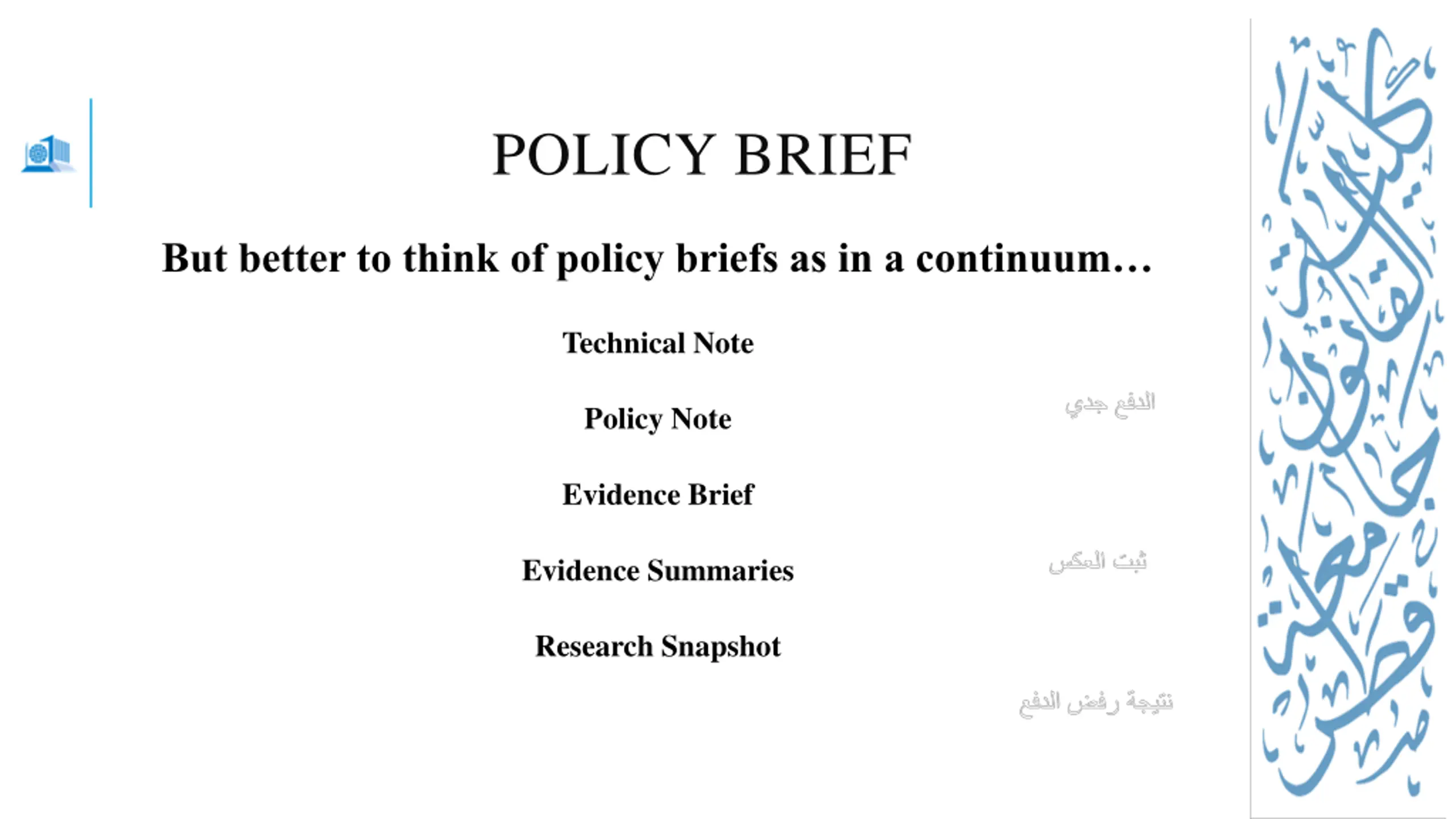 POLICY BRIEF But better to think of policy briefs as in a continuum Technical Note Policy Note Evidence Brief Evidence Summaries Research Snapshot