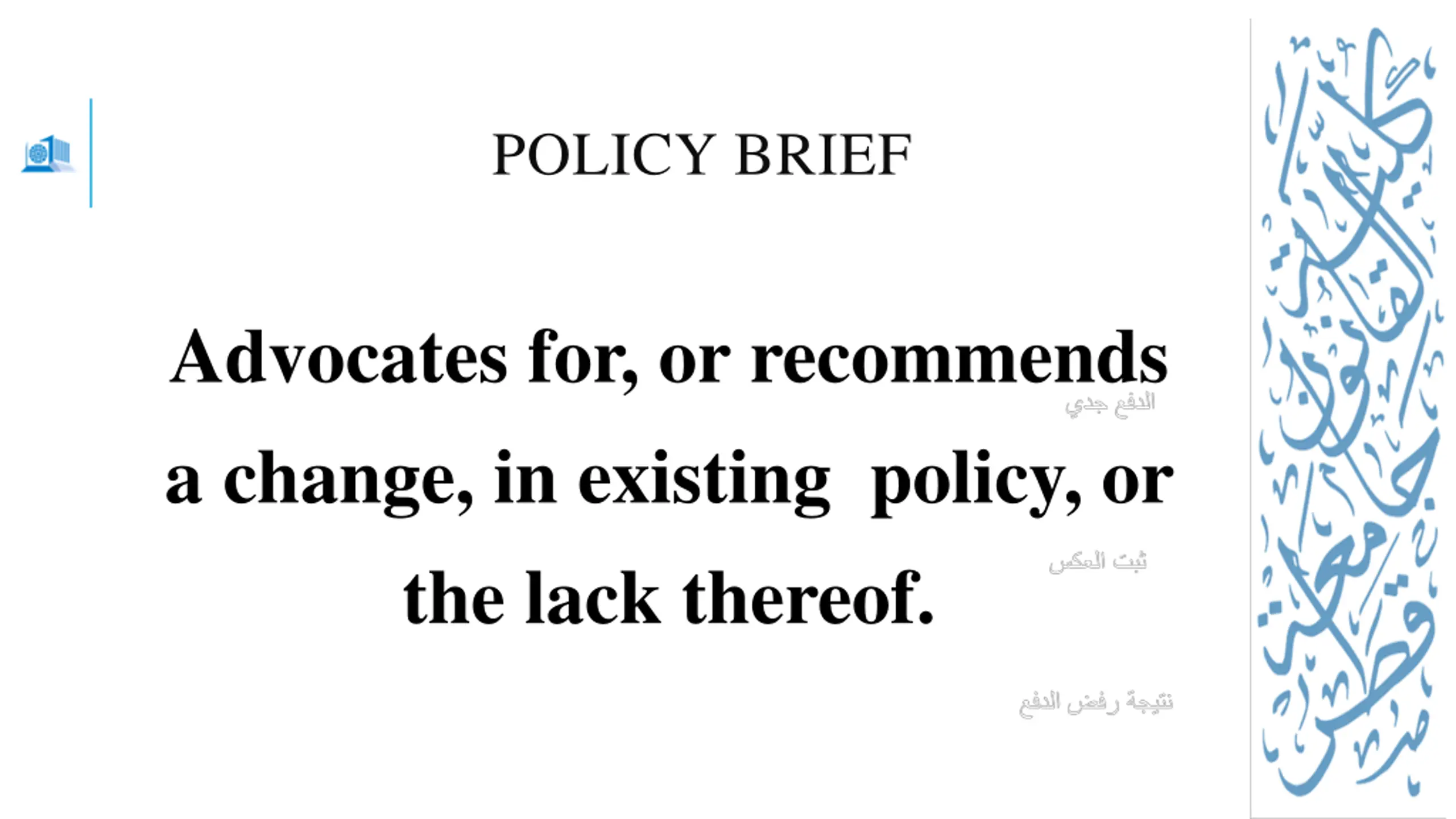 POLICY BRIEF Advocates for, or recommends a change, in existing policy, or the lack thereof.