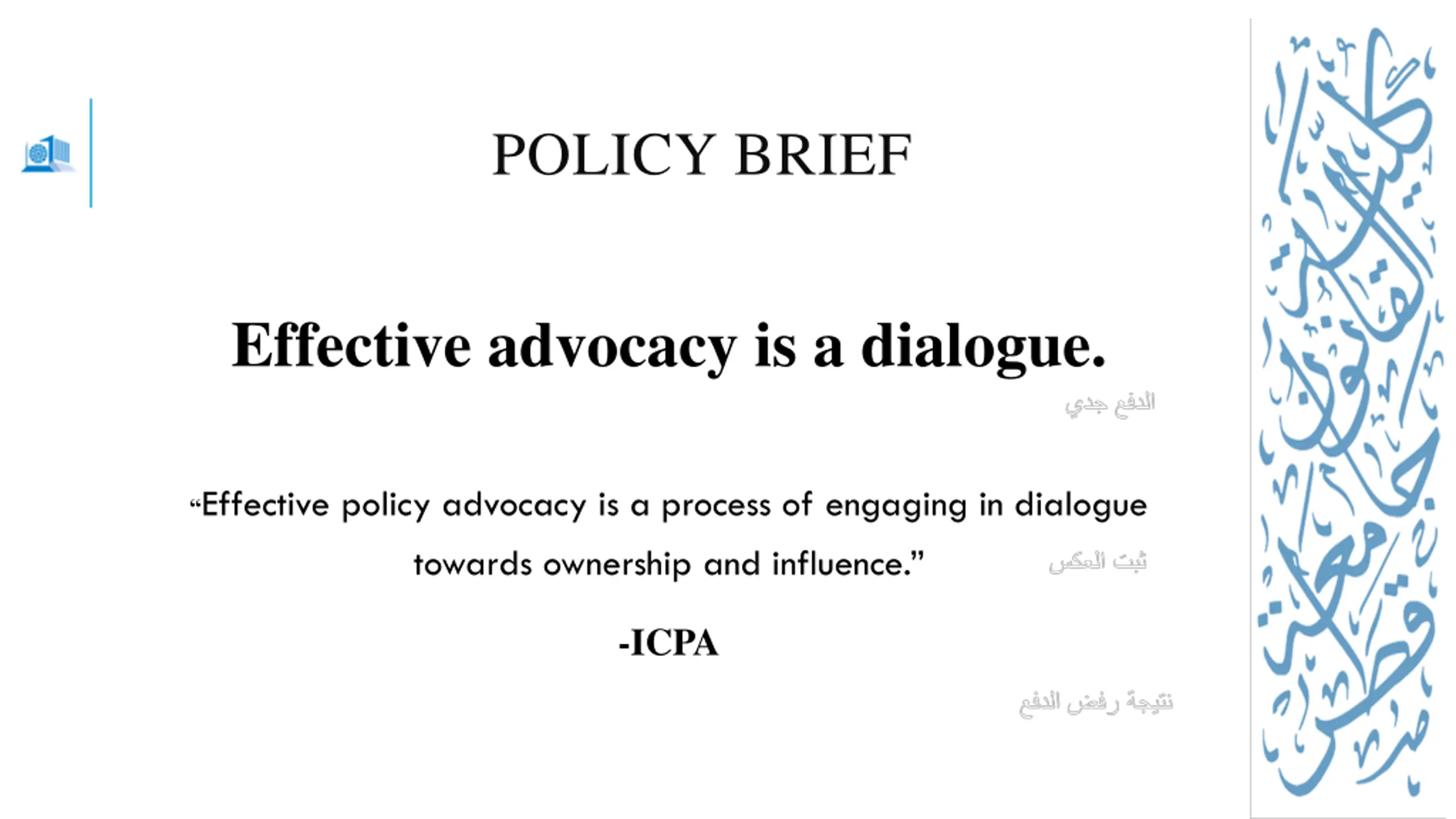 POLICY BRIEF Effective advocacy is a dialogue. Effective policy advocacy is a process of engaging in dialogue towards ownership and influence. -ICPA