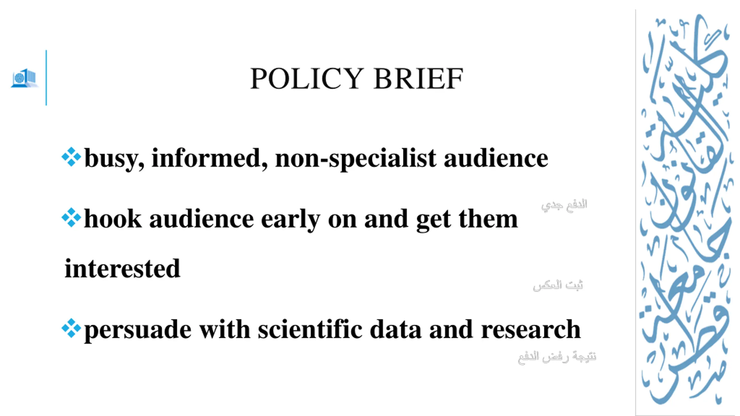 POLICY BRIEF busy, informed, non-specialist audience hook audience early on and get them interested persuade with scientific data and research