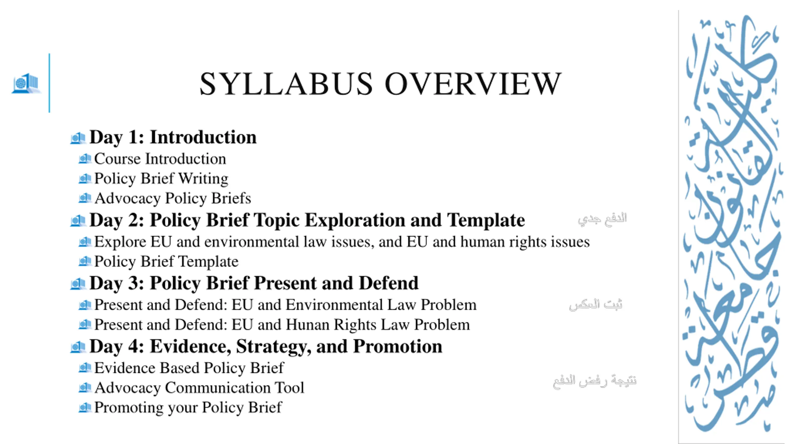 SYLLABUS OVERVIEW Day 1: Introduction Course Introduction Policy Brief Writing Advocacy Policy Briefs Day 2: Policy Brief Topic Exploration and Template Explore EU and environmental law issues, and EU and human rights issues Policy Brief Template Day 3: Policy Brief Present and Defend Present and Defend: EU and Environmental Law Problem Present and Defend: EU and Hunan Rights Law Problem Day 4: Evidence, Strategy, and Promotion Evidence Based Policy Brief Advocacy Communication Tool Promoting your Policy Brief