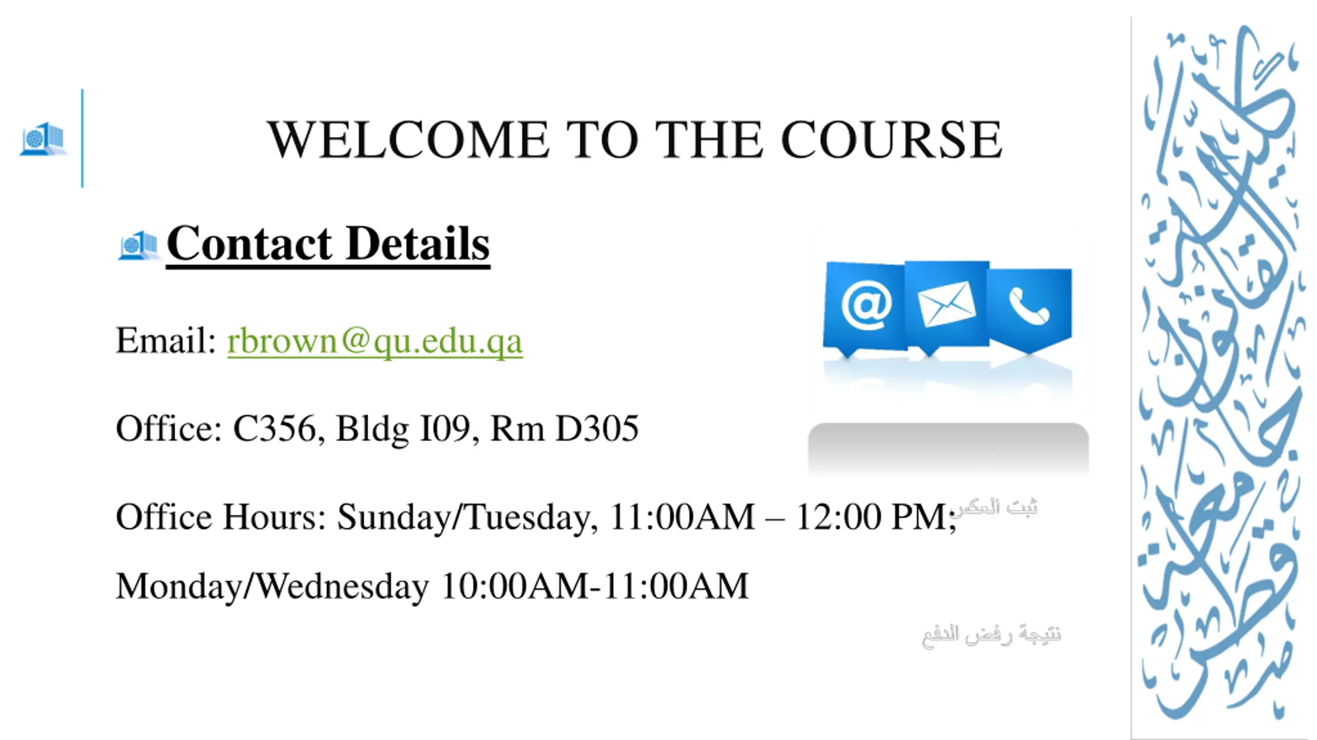 WELCOME TO THE COURSE Contact Details Email: rbrown@qu.edu.qa Office: C356, Bldg I09, Rm D305 Office Hours: Sunday/Tuesday, 11:00AM 12:00 PM; Monday/Wednesday 10:00AM-11:00AM
