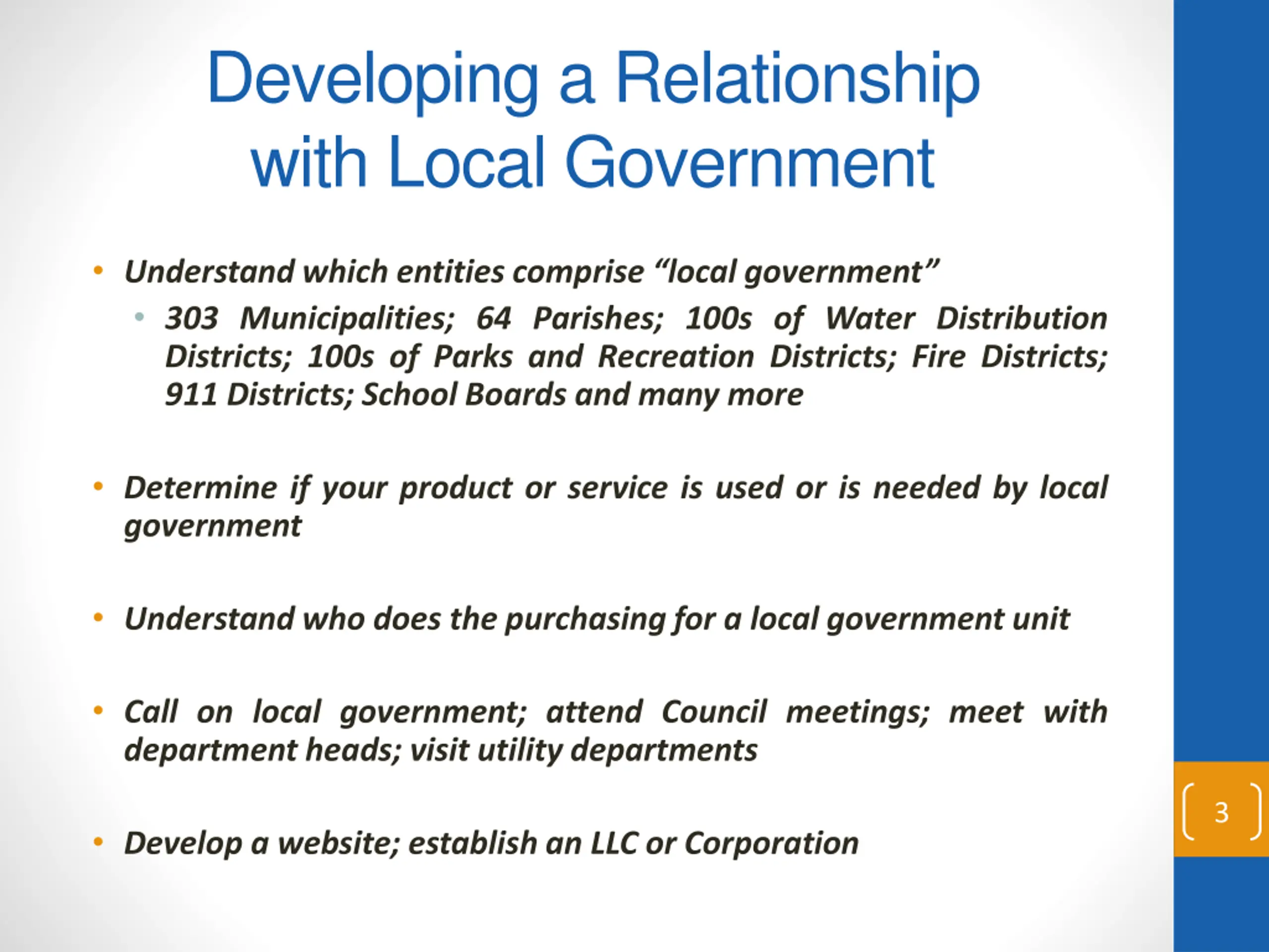 Developing a Relationship with Local Government Understand which entities comprise localgovernment 303 Municipalities; 64 Parishes; 100s of Water Distribution Districts; 100s of Parks and Recreation Districts; Fire Districts; 911 Districts; School Boards and many more Determine if your product or service is used or is needed by local government Understand who does the purchasing for a local government unit Call on local government; attend Council meetings; meet with department heads; visit utility departments 3 Develop a website; establish an LLC or Corporation