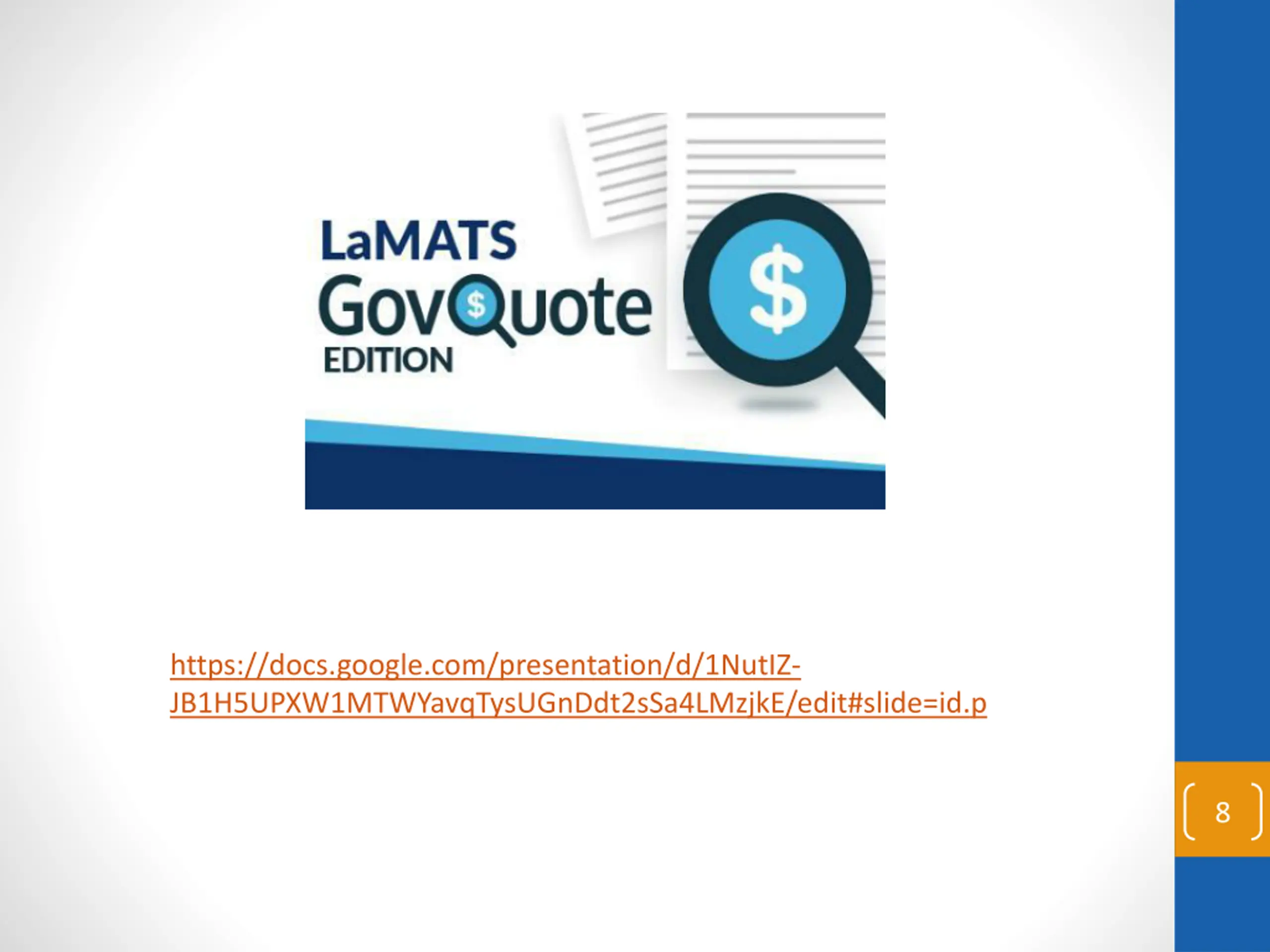How to Register as Vendors Registering with GovQuote LaMATS Edition or EASiBuy is at no cost Submitting a quote or a bid is at no cost Vendors who are awarded a contract pay a small administrative fee to the platform provider www.govquote.us www.easibuy.com 6