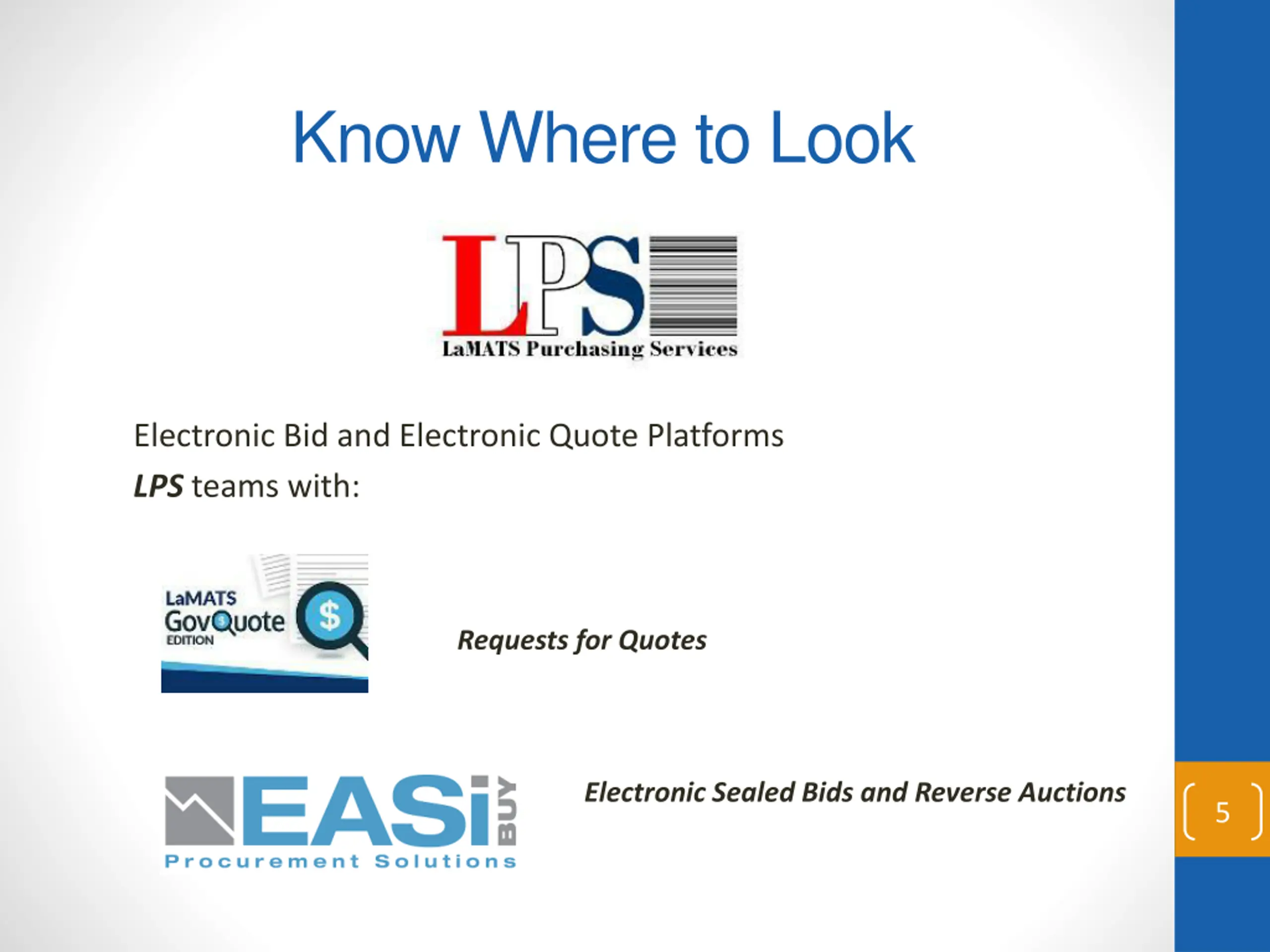 Know Where to Look Electronic Bid and Electronic Quote Platforms LPS teams with: Requests for Quotes Electronic Sealed Bids and Reverse Auctions 5