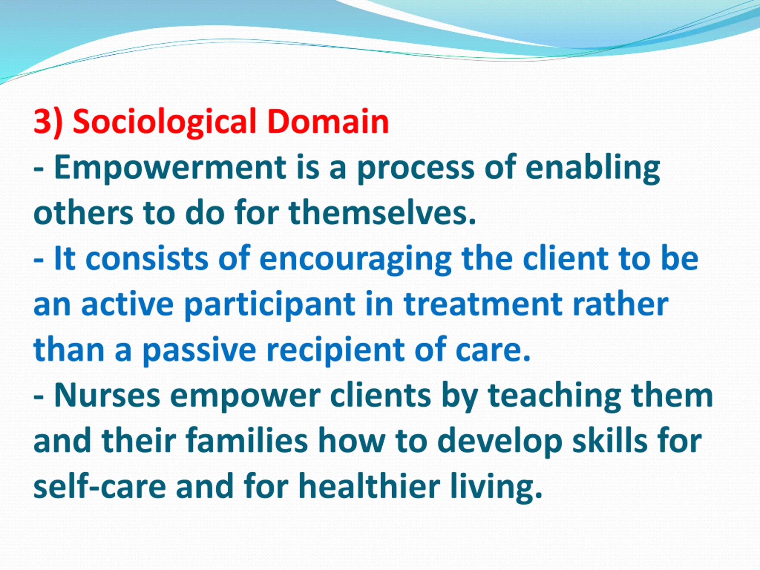 3) Sociological Domain - Empowerment is a process of enabling others to do for themselves. - It consists of encouraging the client to be an active participant in treatment rather than a passive recipient of care. - Nurses empower clients by teaching them and their families how to develop skills for self-care and for healthier living.