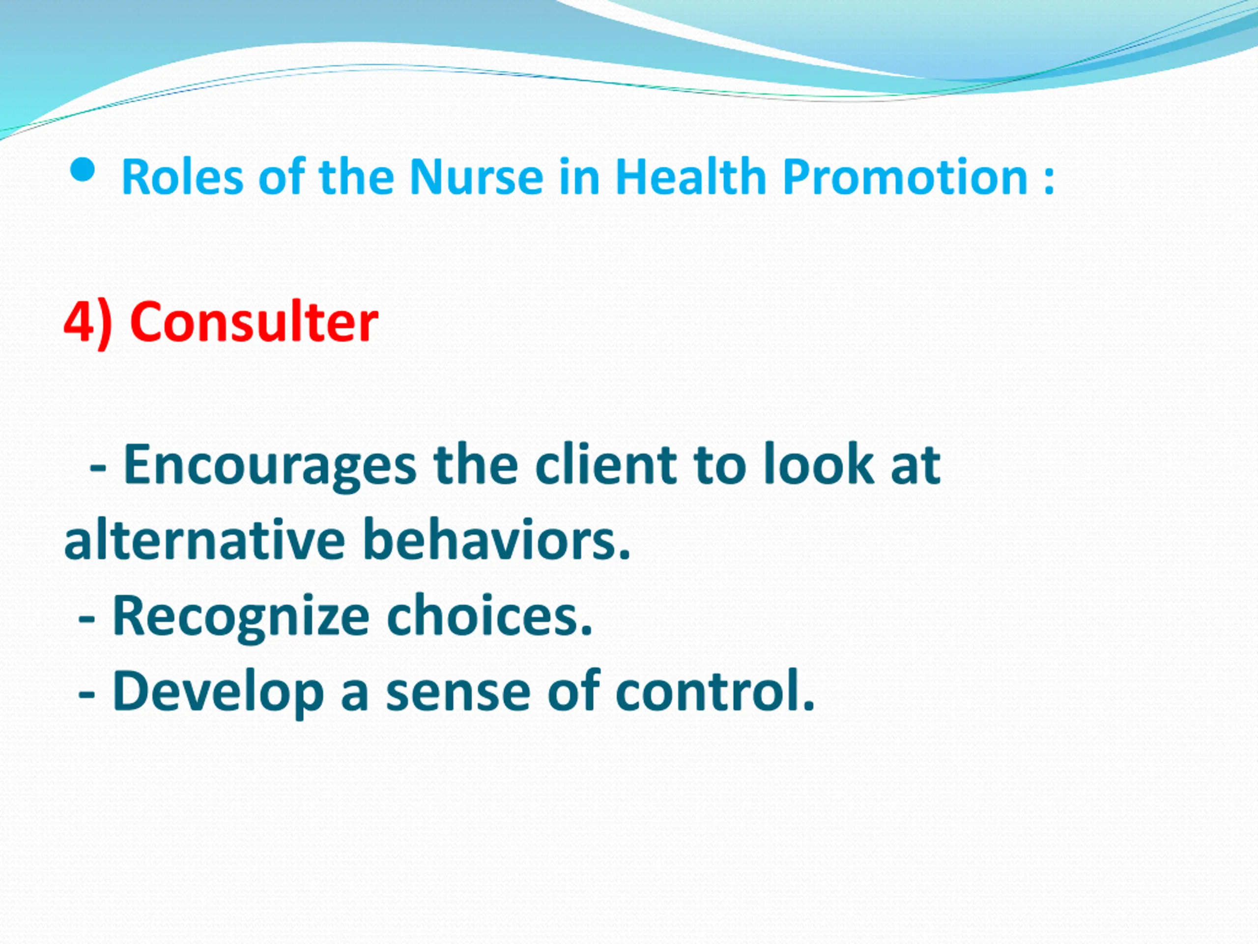 Roles of the Nurse in Health Promotion : 4) Consulter - Encourages the client to look at alternative behaviors. - Recognize choices. - Develop a sense of control.