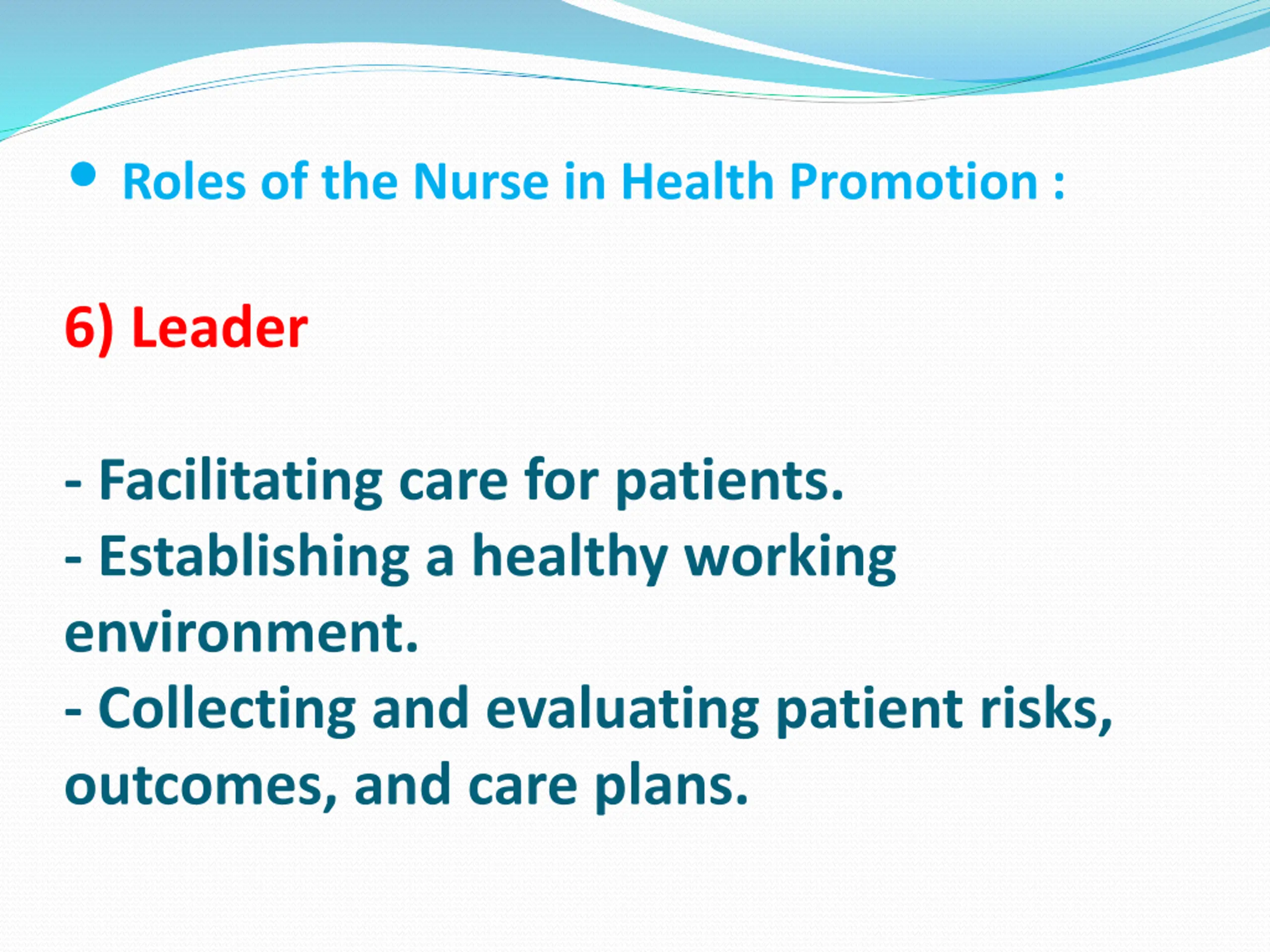 Roles of the Nurse in Health Promotion : 6) Leader - Facilitating care for patients. - Establishing a healthy working environment. - Collecting and evaluating patient risks, outcomes, and care plans.
