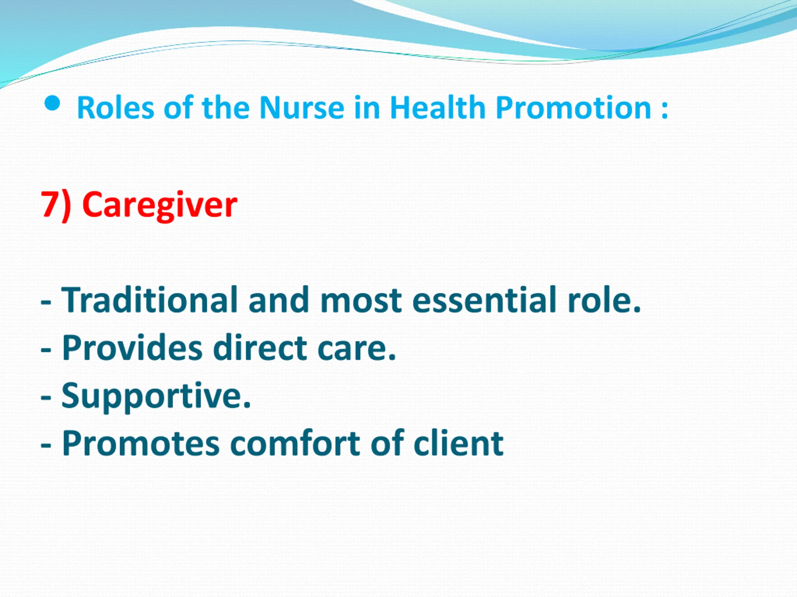 Roles of the Nurse in Health Promotion : 7) Caregiver - Traditional and most essential role. - Provides direct care. - Supportive. - Promotes comfort of client