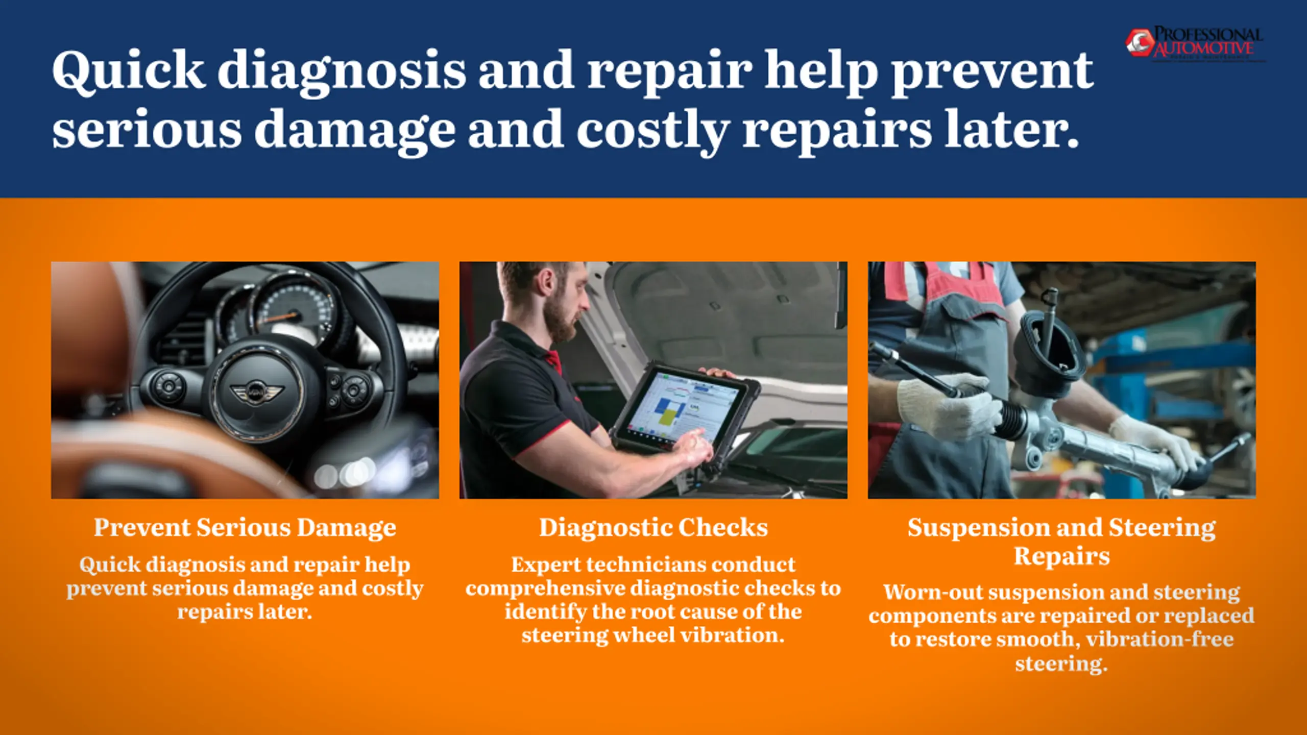 Quick diagnosis and repair help prevent serious damage and costly repairs later. Prevent Serious Damage Diagnostic Checks Suspension and Steering Repairs Quick diagnosis and repair help prevent serious damage and costly repairs later. Expert technicians conduct comprehensive diagnostic checks to identify the root cause of the steering wheel vibration. Worn-out suspension and steering components are repaired or replaced to restore smooth, vibration-free steering.