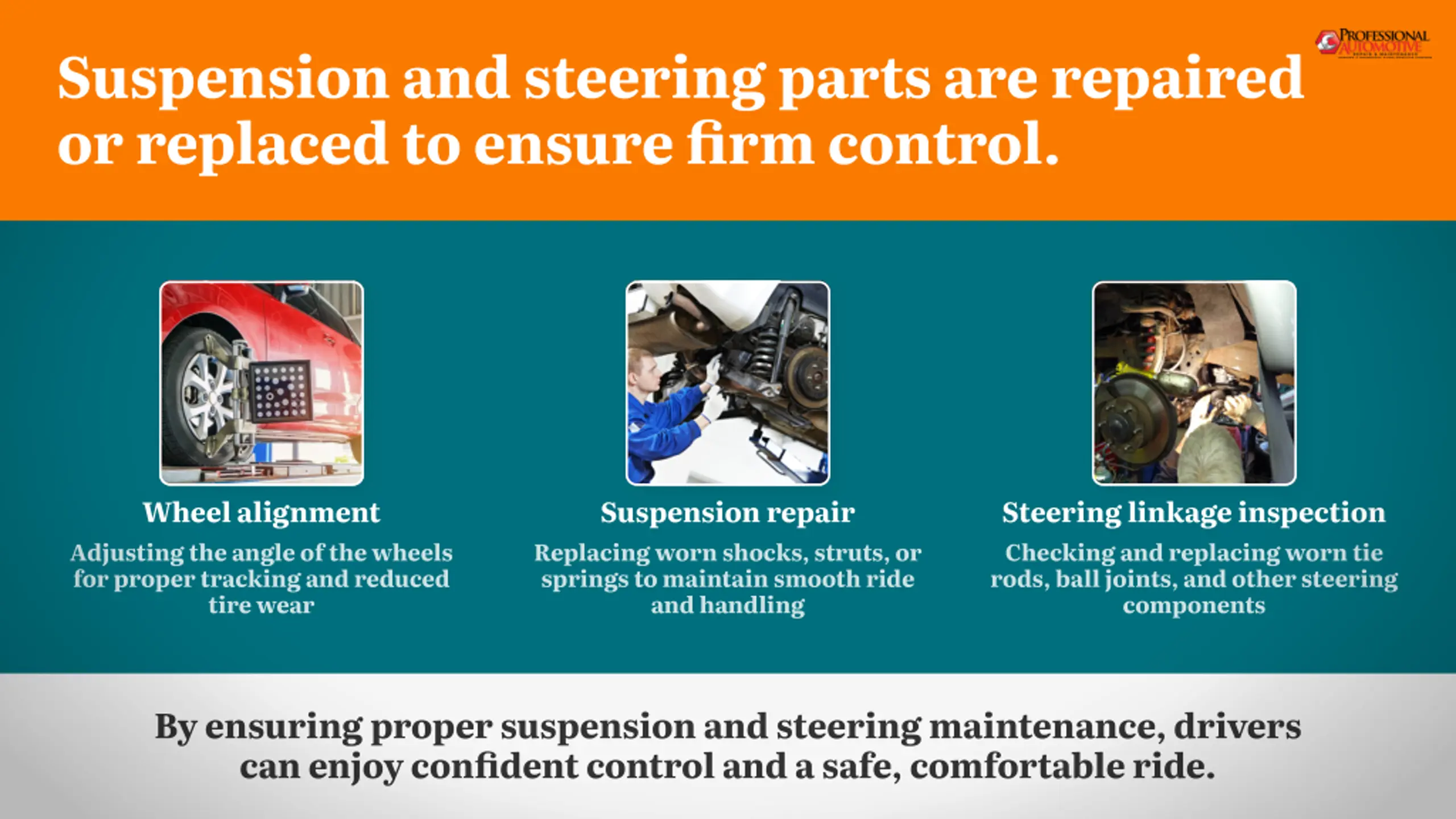 Suspension and steering parts are repaired or replaced to ensure firm control. Wheel alignment Suspension repair Steering linkage inspection Adjusting the angle of the wheels for proper tracking and reduced tire wear Replacing worn shocks, struts, or springs to maintain smooth ride and handling Checking and replacing worn tie rods, ball joints, and other steering components By ensuring proper suspension and steering maintenance, drivers can enjoy confident control and a safe, comfortable ride.
