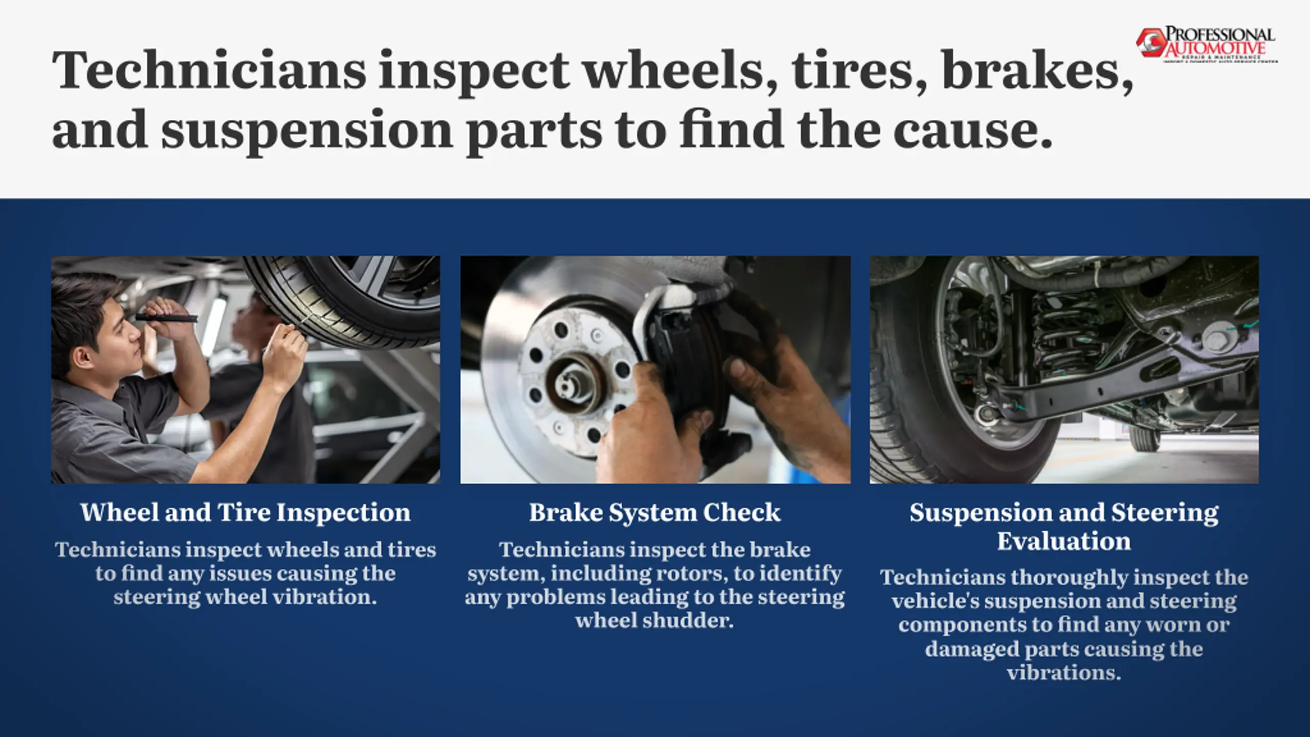 Technicians inspect wheels, tires, brakes, and suspension parts to find the cause. Wheel and Tire Inspection Brake System Check Suspension and Steering Evaluation Technicians inspect wheels and tires to find any issues causing the steering wheel vibration. Technicians inspect the brake system, including rotors, to identify any problems leading to the steering wheel shudder. Technicians thoroughly inspect the vehicle's suspension and steering components to find any worn or damaged parts causing the vibrations.