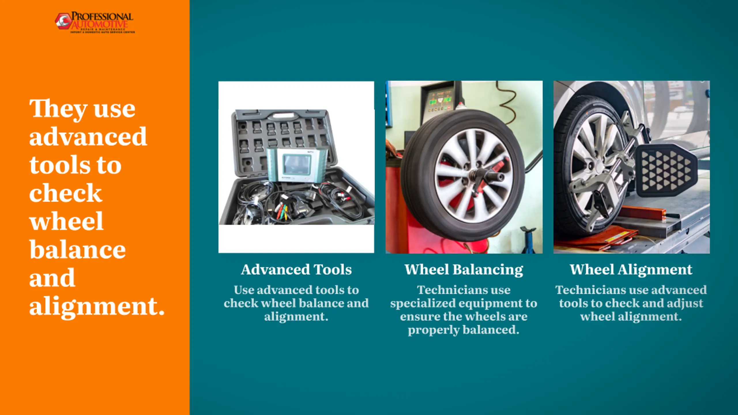 They use advanced tools to check wheel balance and alignment. Advanced Tools Wheel Balancing Wheel Alignment Use advanced tools to check wheel balance and alignment. Technicians use specialized equipment to ensure the wheels are properly balanced. Technicians use advanced tools to check and adjust wheel alignment.