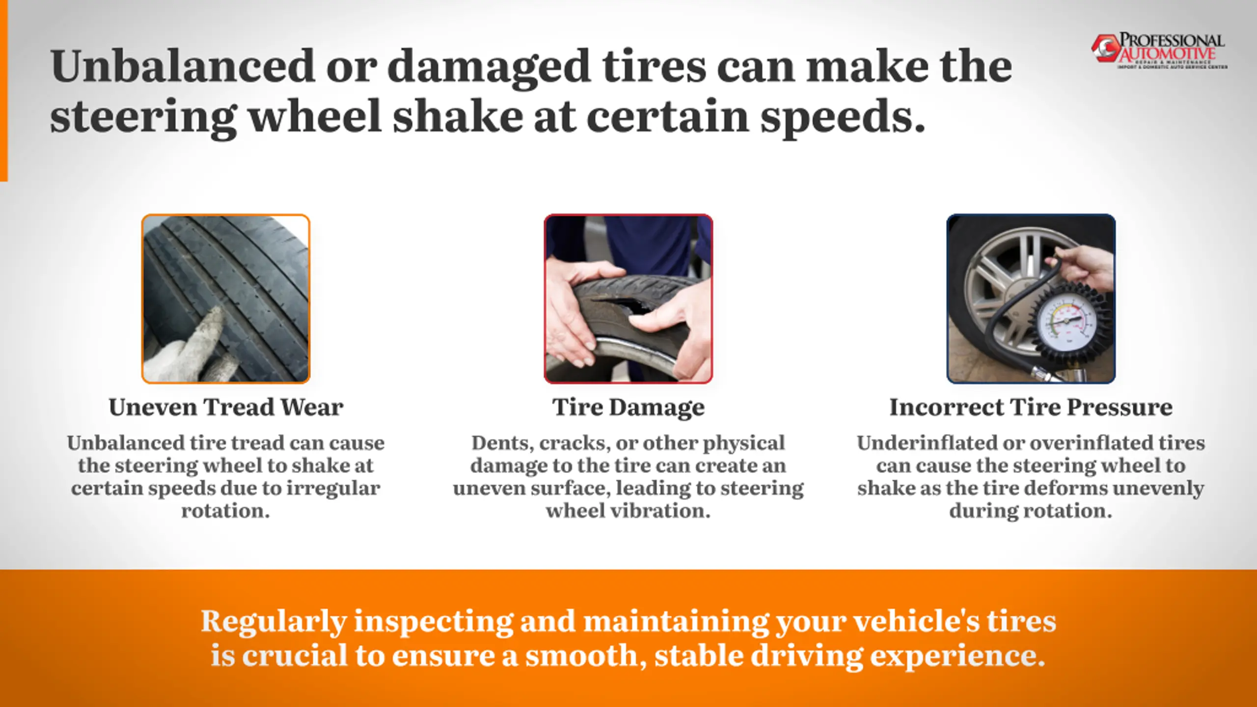 Unbalanced or damaged tires can make the steering wheel shake at certain speeds. Uneven Tread Wear Tire Damage Incorrect Tire Pressure Unbalanced tire tread can cause the steering wheel to shake at certain speeds due to irregular rotation. Dents, cracks, or other physical damage to the tire can create an uneven surface, leading to steering wheel vibration. Underinflated or overinflated tires can cause the steering wheel to shake as the tire deforms unevenly during rotation. Regularly inspecting and maintaining your vehicle's tires is crucial to ensure a smooth, stable driving experience.