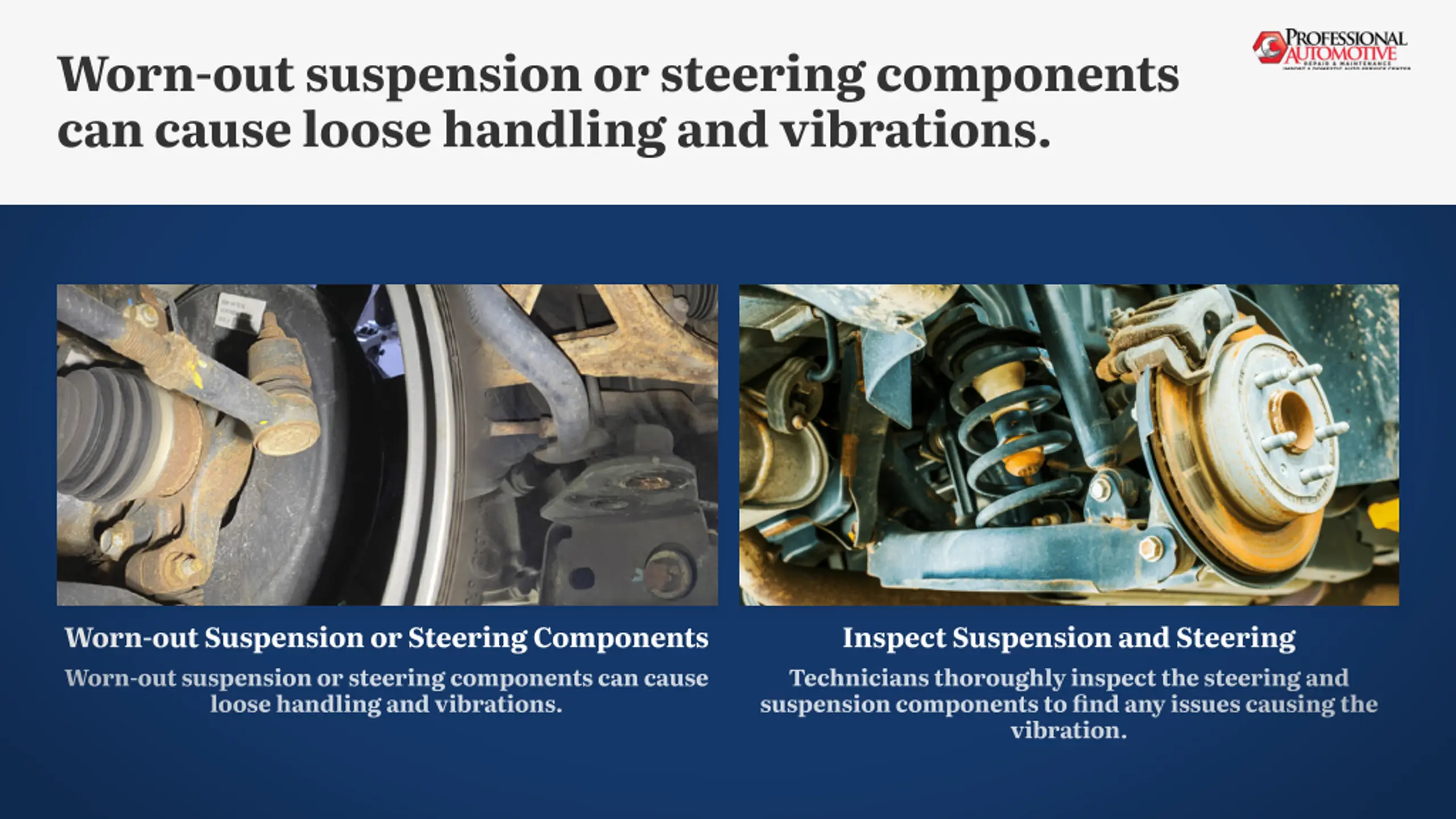 Worn-out suspension or steering components can cause loose handling and vibrations. Worn-out Suspension or Steering Components Inspect Suspension and Steering Worn-out suspension or steering components can cause loose handling and vibrations. Technicians thoroughly inspect the steering and suspension components to find any issues causing the vibration.