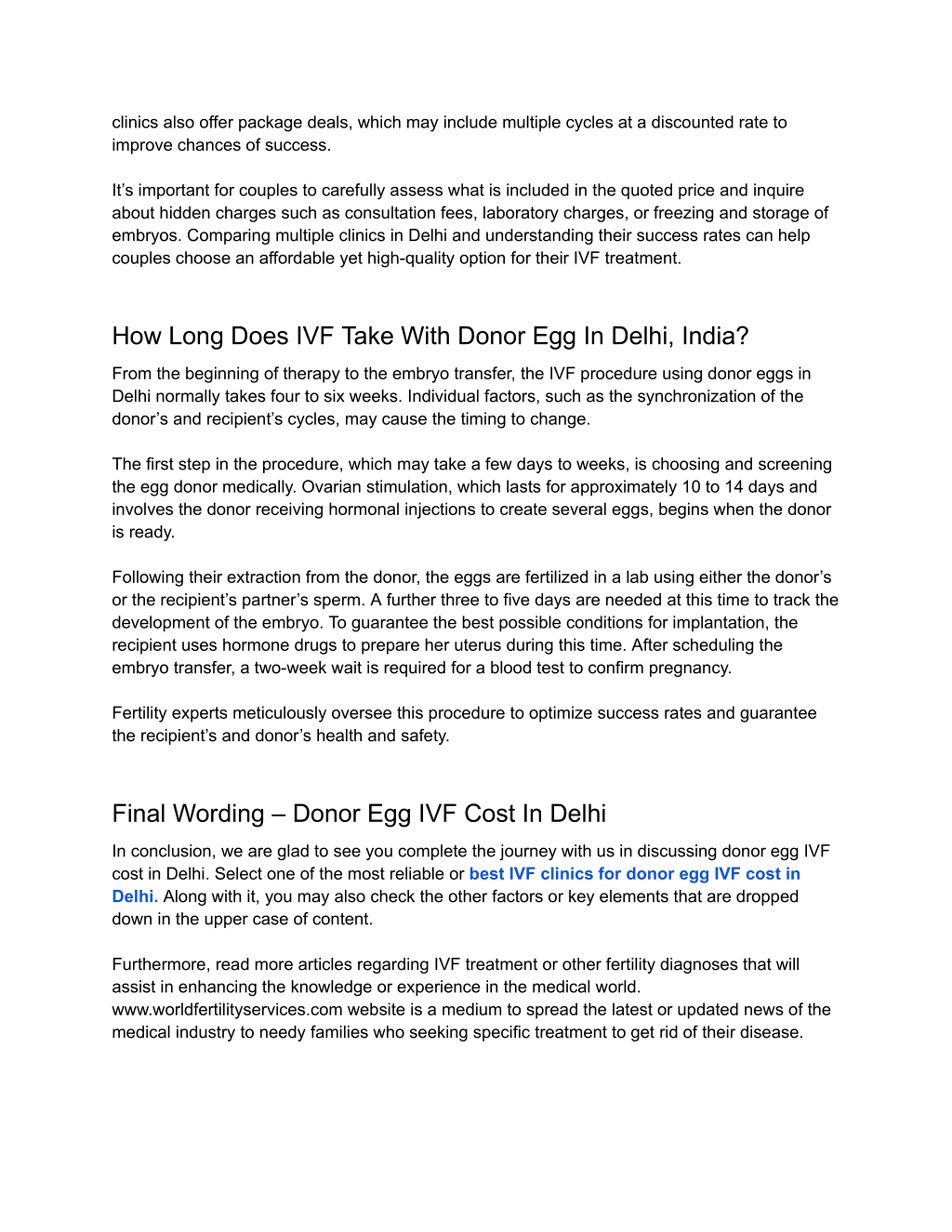 clinics also offer package deals, which may include multiple cycles at a discounted rate to improve chances of success. It s important for couples to carefully assess what is included in the quoted price and inquire about hidden charges such as consultation fees, laboratory charges, or freezing and storage of embryos. Comparing multiple clinics in Delhi and understanding their success rates can help couples choose an affordable yet high-quality option for their IVF treatment. How Long Does IVF Take With Donor Egg In Delhi, India? From the beginning of therapy to the embryo transfer, the IVF procedure using donor eggs in Delhi normally takes four to six weeks. Individual factors, such as the synchronization of the donor s and recipient s cycles, may cause the timing to change. The first step in the procedure, which may take a few days to weeks, is choosing and screening the egg donor medically. Ovarian stimulation, which lasts for approximately 10 to 14 days and involves the donor receiving hormonal injections to create several eggs, begins when the donor is ready. Following their extraction from the donor, the eggs are fertilized in a lab using either the donor s or the recipient s partner s sperm. A further three to five days are needed at this time to track the development of the embryo. To guarantee the best possible conditions for implantation, the recipient uses hormone drugs to prepare her uterus during this time. After scheduling the embryo transfer, a two-week wait is required for a blood test to confirm pregnancy. Fertility experts meticulously oversee this procedure to optimize success rates and guarantee the recipient s and donor s health and safety. Final Wording Donor Egg IVF Cost In Delhi In conclusion, we are glad to see you complete the journey with us in discussing donor egg IVF cost in Delhi. Select one of the most reliable or best IVF clinics for donor egg IVF cost in Delhi. Along with it, you may also check the other factors or key elements that are dropped down in the upper case of content. Furthermore, read more articles regarding IVF treatment or other fertility diagnoses that will assist in enhancing the knowledge or experience in the medical world. www.worldfertilityservices.com website is a medium to spread the latest or updated news of the medical industry to needy families who seeking specific treatment to get rid of their disease.