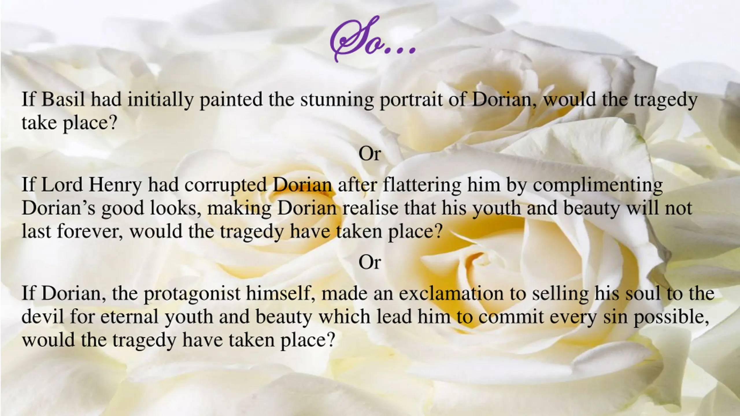 So So If Basil had initially painted the stunning portrait of Dorian, would the tragedy take place? Or If Lord Henry had corrupted Dorian after flattering him by complimenting Dorian s good looks, making Dorian realise that his youth and beauty will not last forever, would the tragedy have taken place? Or If Dorian, the protagonist himself, made an exclamation to selling his soul to the devil for eternal youth and beauty which lead him to commit every sin possible, would the tragedy have taken place?