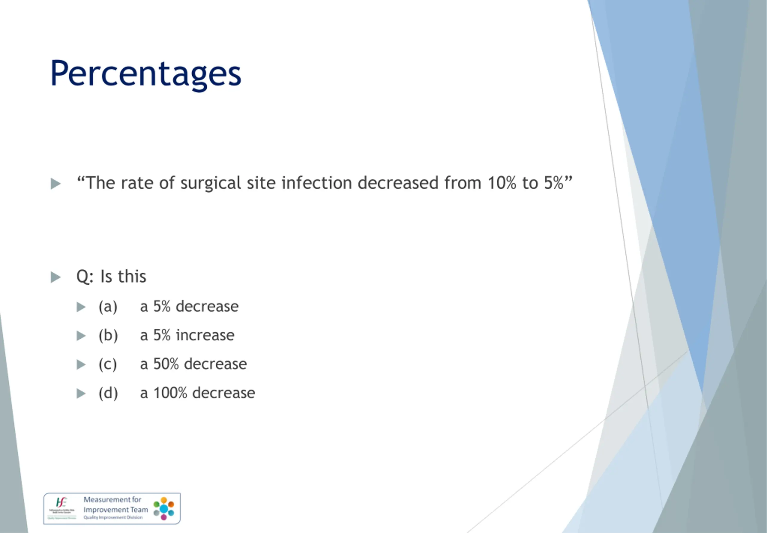 Percentages The rate of surgical site infection decreased from 10% to 5% Q: Is this (a) a 5% decrease (b) a 5% increase (c) a 50% decrease (d) a 100% decrease