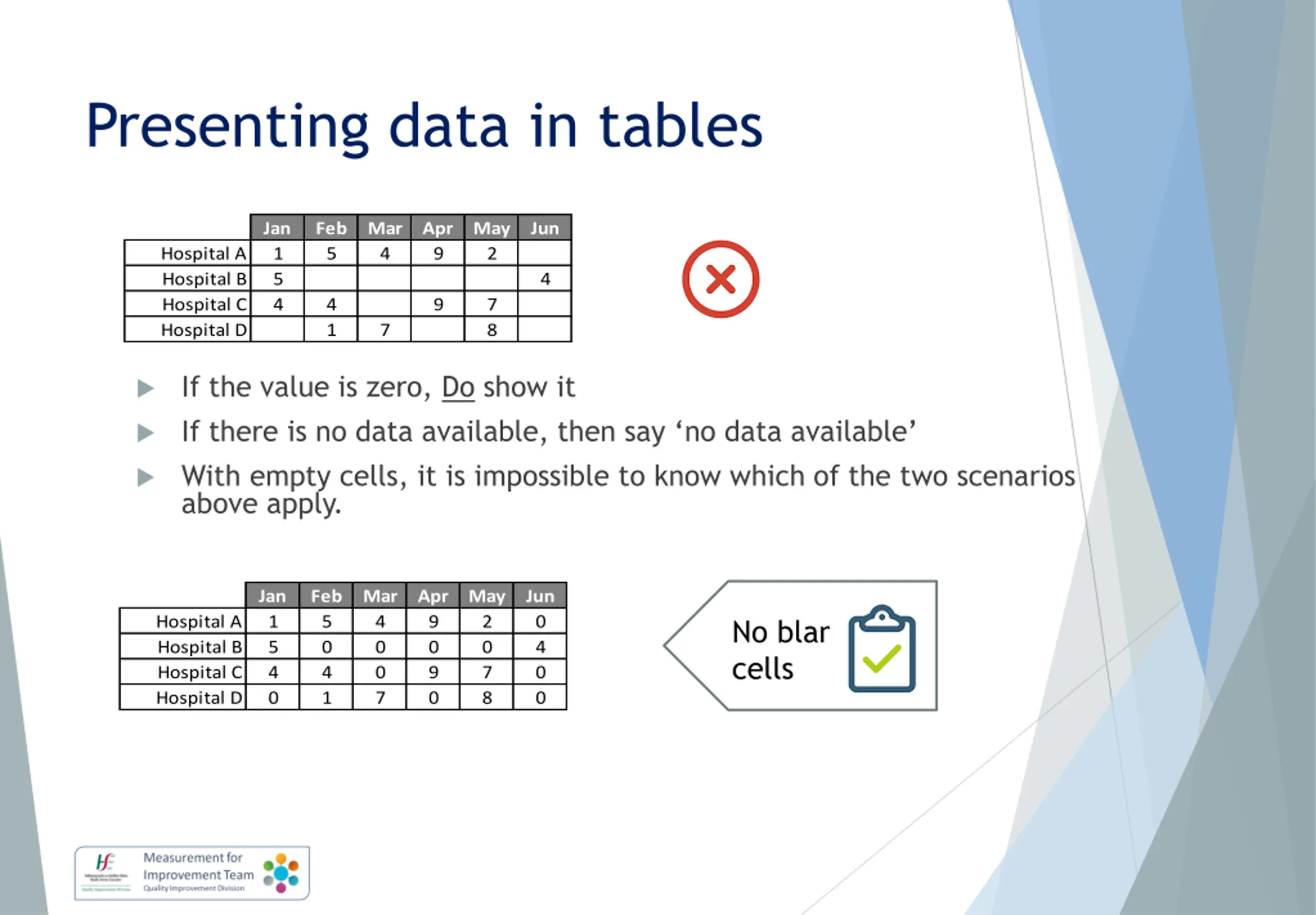 Presenting data in tables Image result for dos and donts Jan 1 5 4 Feb 5 Mar 4 Apr 9 May 2 Jun Hospital A Hospital B Hospital C Hospital D 4 4 1 9 7 8 7 If the value is zero, Do show it If there is no data available, then say no data available With empty cells, it is impossible to know which of the two scenarios above apply. Jan 1 5 4 0 Feb 5 0 4 1 Mar 4 0 0 7 Apr 9 0 9 0 May 2 0 7 8 Jun 0 4 0 0 Image result for dos and donts Hospital A Hospital B Hospital C Hospital D No blank cells