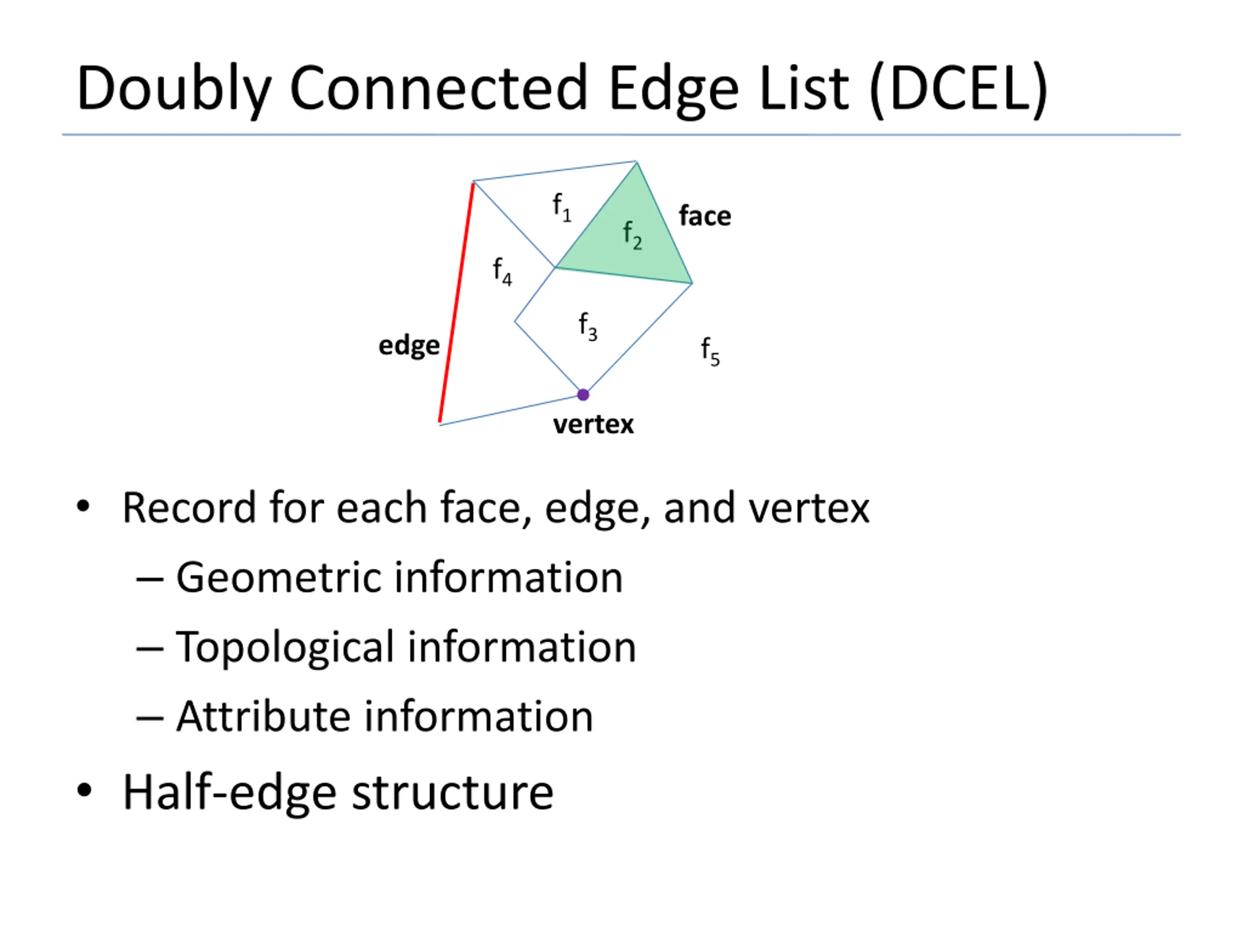 Doubly Connected Edge List (DCEL) f1 face f2 f4 f3 edge f5 vertex Record for each face, edge, and vertex Geometric information Topological information Attribute information Half-edge structure