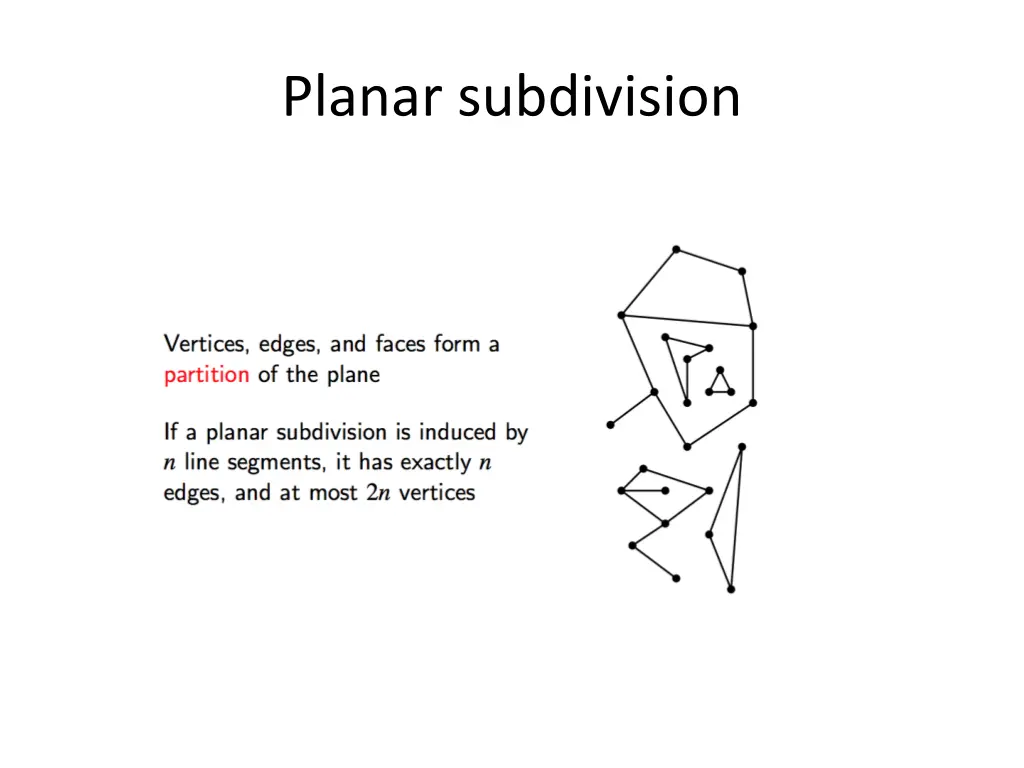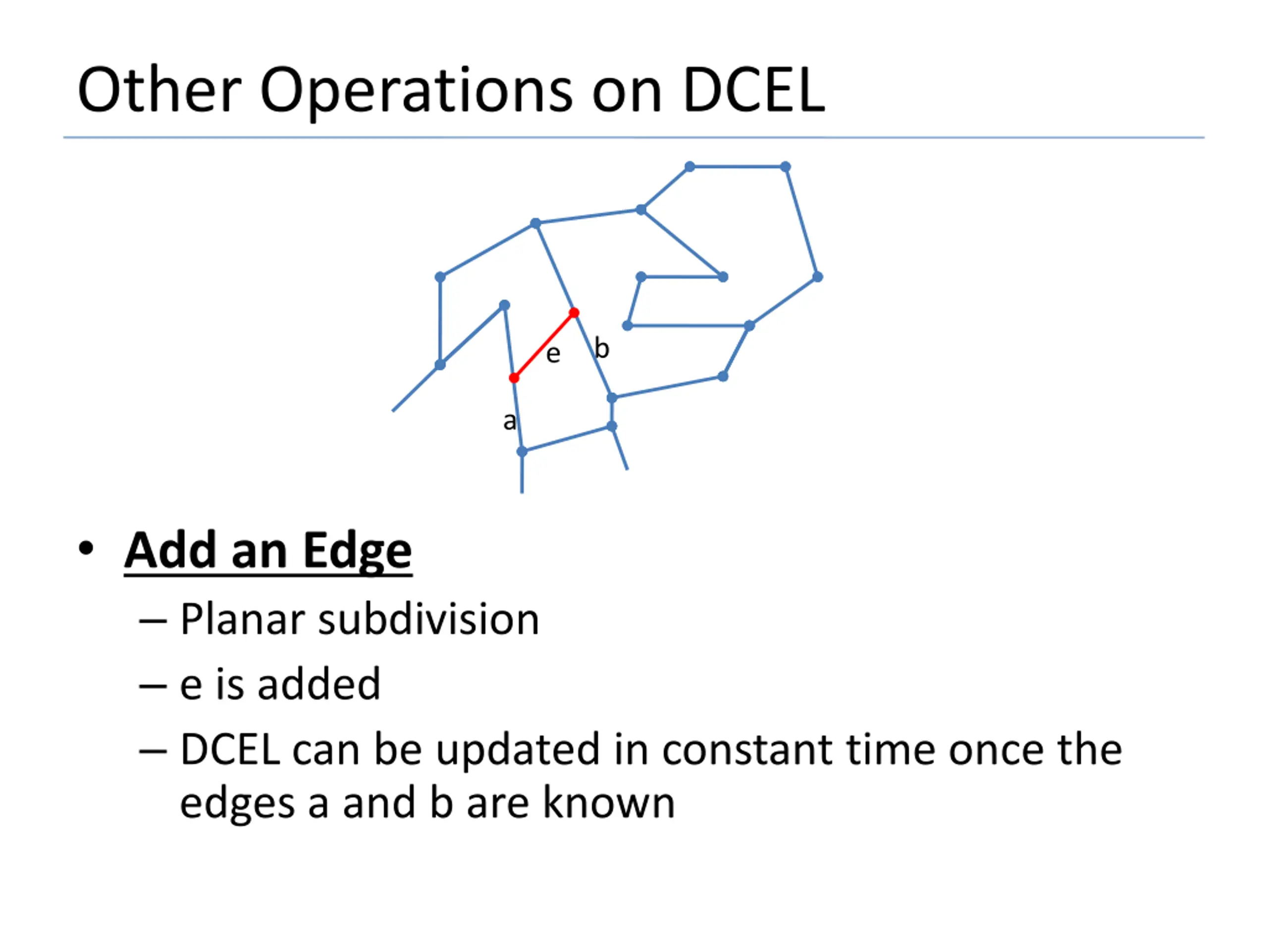 Other Operations on DCEL b e a Add an Edge Planar subdivision e is added DCEL can be updated in constant time once the edges a and b are known