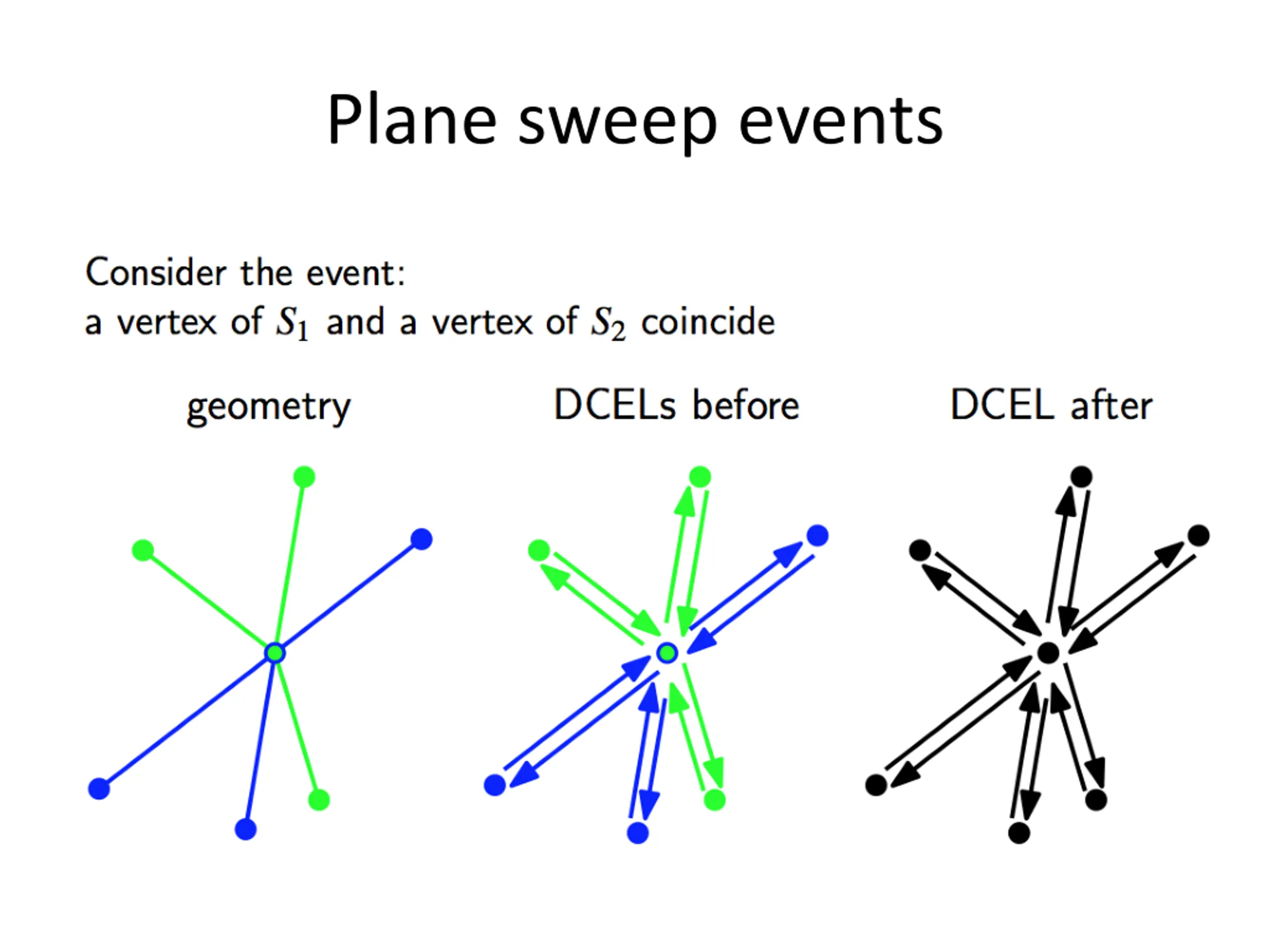 Doubly Connected Edge List (DCEL) e7,2 v6 v3 e7,1 f3 e1,2 e5,2 e6,1 f5 e5,1 e1,1 f1 e6,2 e9,2 e9,1 f4 e3,1 e3,2 f2 v1 e8,1 e2,1 v4 e4,1 e2,2 e8,2 e4,2 v5 v2 Operations: Walk around the boundary of a given face in CCW order Access a face from an adjacent one Visit all the edges around a given vertex