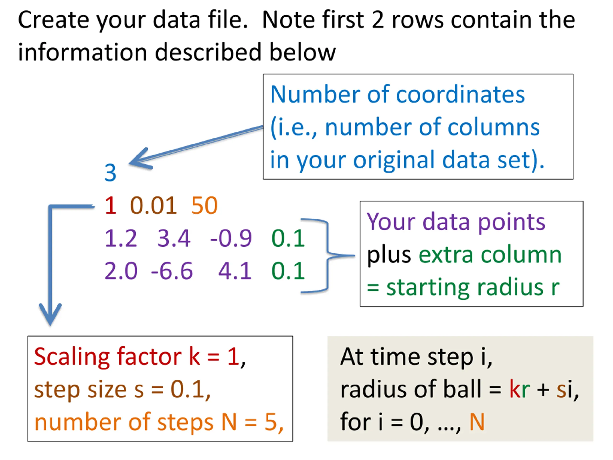Create your data file. Note first 2 rows contain the information described below Number of coordinates (i.e., number of columns in your original data set). 3 1 0.01 50 1.2 3.4 -0.9 0.1 2.0 -6.6 4.1 0.1 Your data points plus extra column = starting radius r Scaling factor k = 1, step size s = 0.1, number of steps N = 5, At time step i, radius of ball = kr + si, for i = 0, , N