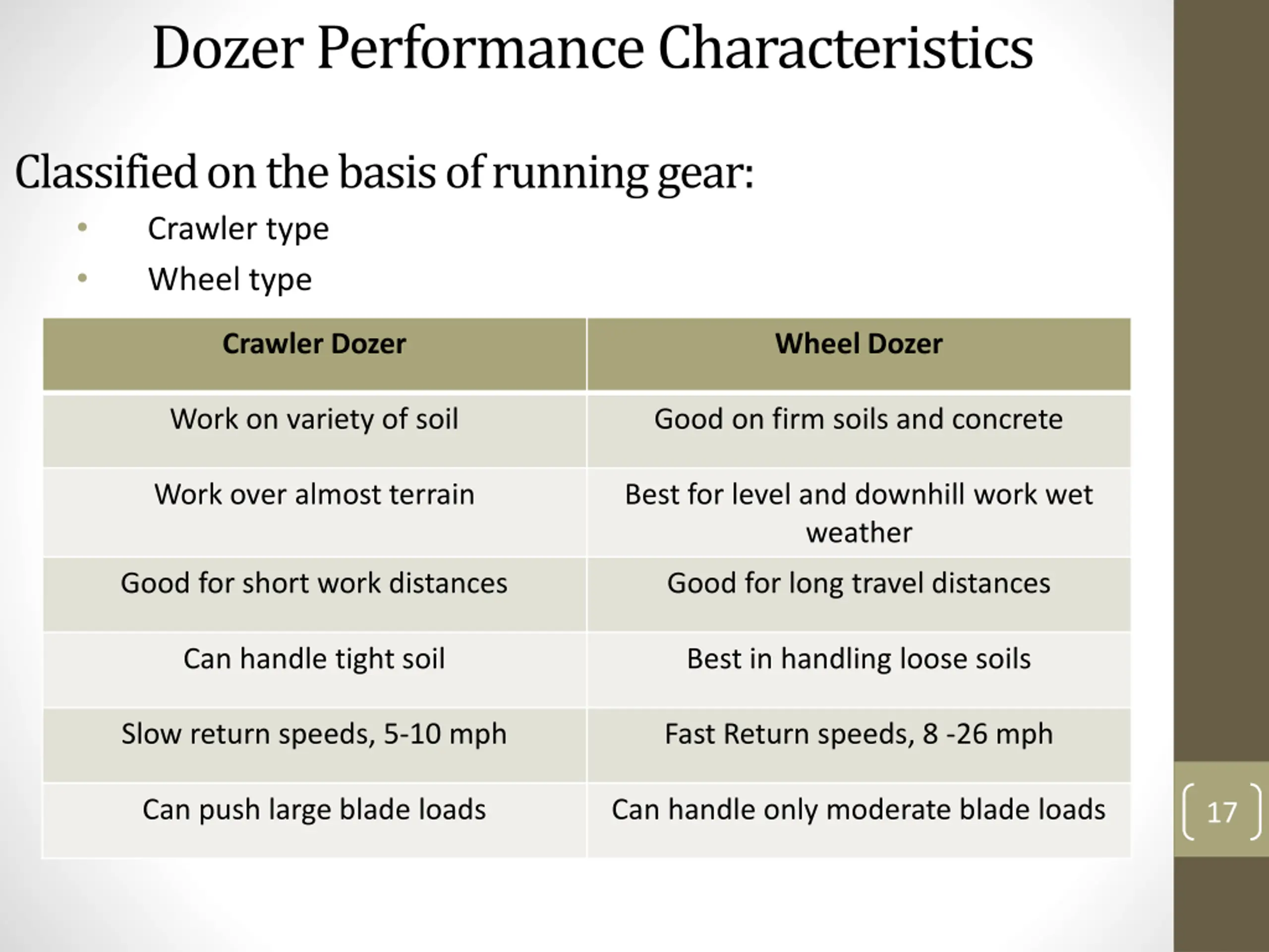 Dozer Performance Characteristics Classified on the basis of running gear: Crawler type Wheel type Crawler Dozer Wheel Dozer Work on variety of soil Good on firm soils and concrete Work over almost terrain Best for level and downhill work wet weather Good for short work distances Good for long travel distances Can handle tight soil Best in handling loose soils Slow return speeds, 5-10 mph Fast Return speeds, 8 -26 mph Can push large blade loads Can handle only moderate blade loads 17