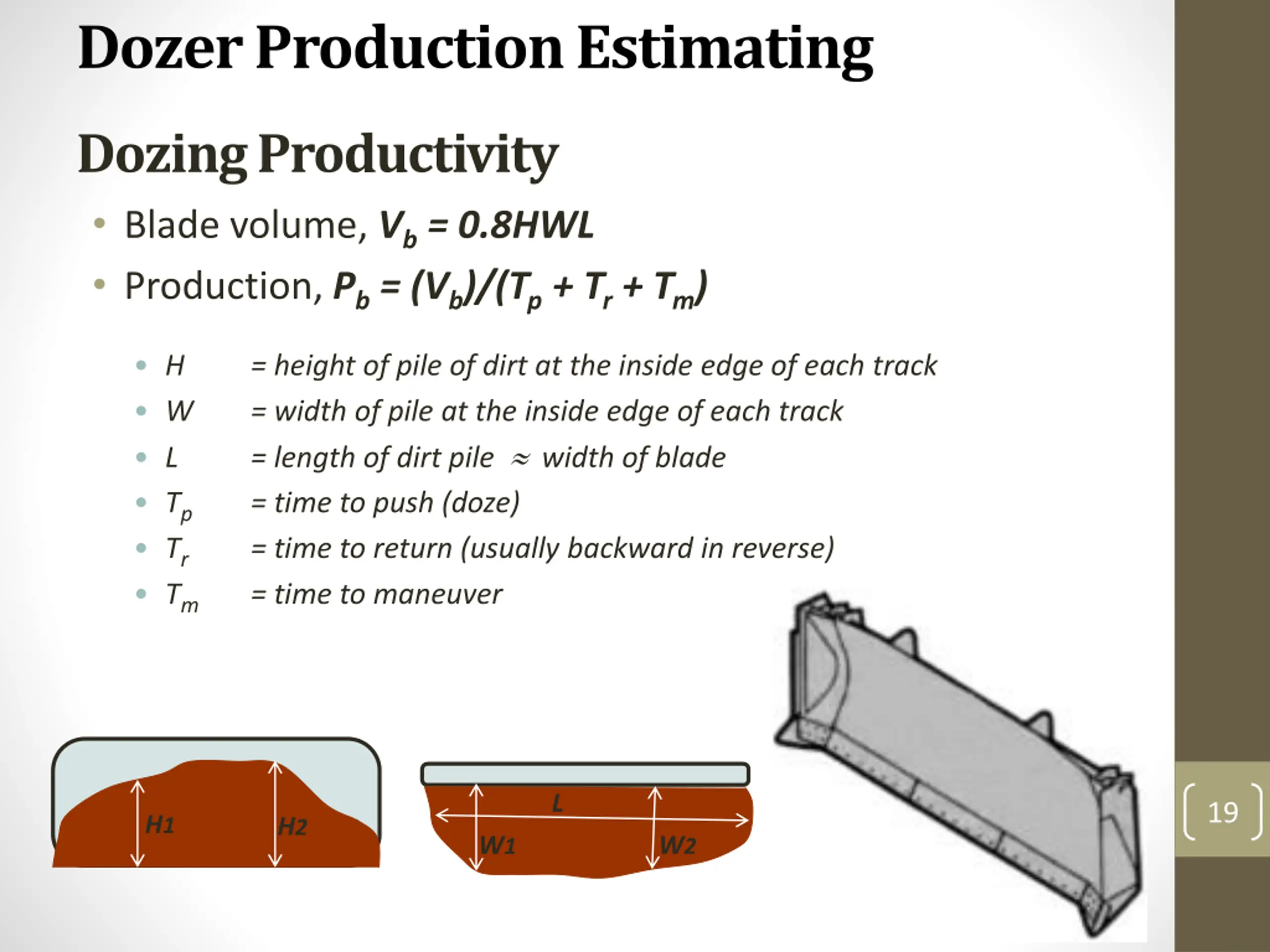 Dozer Production Estimating Dozing Productivity Blade volume, Vb = 0.8HWL Production, Pb = (Vb)/(Tp + Tr + Tm) H W L Tp Tr Tm = height of pile of dirt at the inside edge of each track = width of pile at the inside edge of each track = length of dirt pile width of blade = time to push (doze) = time to return (usually backward in reverse) = time to maneuver L 19 H1 H2 W1 W2