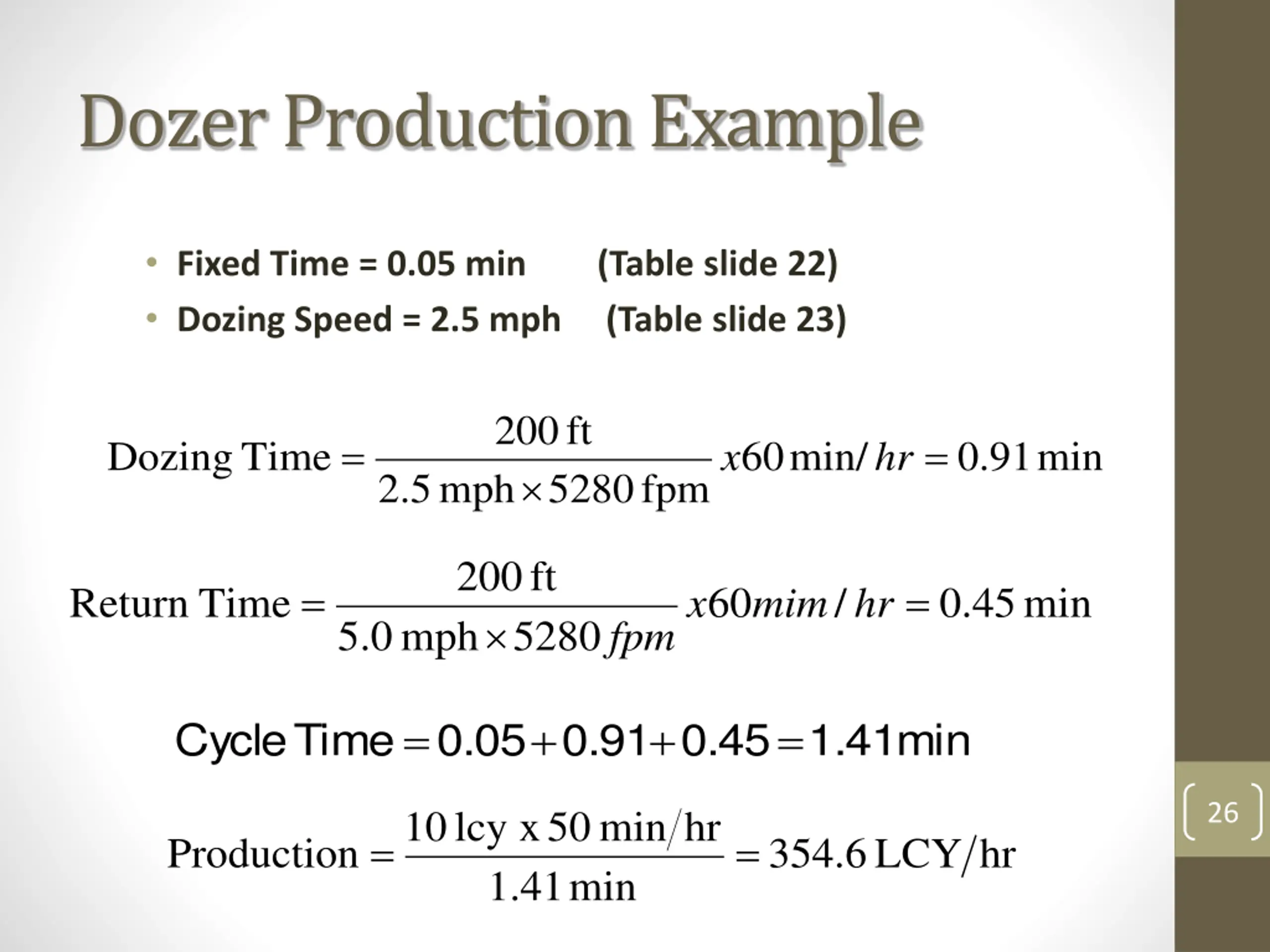 Dozer Production Example Fixed Time = 0.05 min (Table slide 22) Dozing Speed = 2.5 mph (Table slide 23) 200 ft = = Dozing Time 60 min/ 0.91 min x hr 2.5 mph 5280 fpm 200 ft = = Return Time 60 / 0.45 min x mim hr 5.0 mph 280 5 fpm = + + = Cycle Time 0.05 0.91 0.45 1.41 min 26 lcy x 10 50 min hr = = Production 354.6 LCY hr 1.41 min