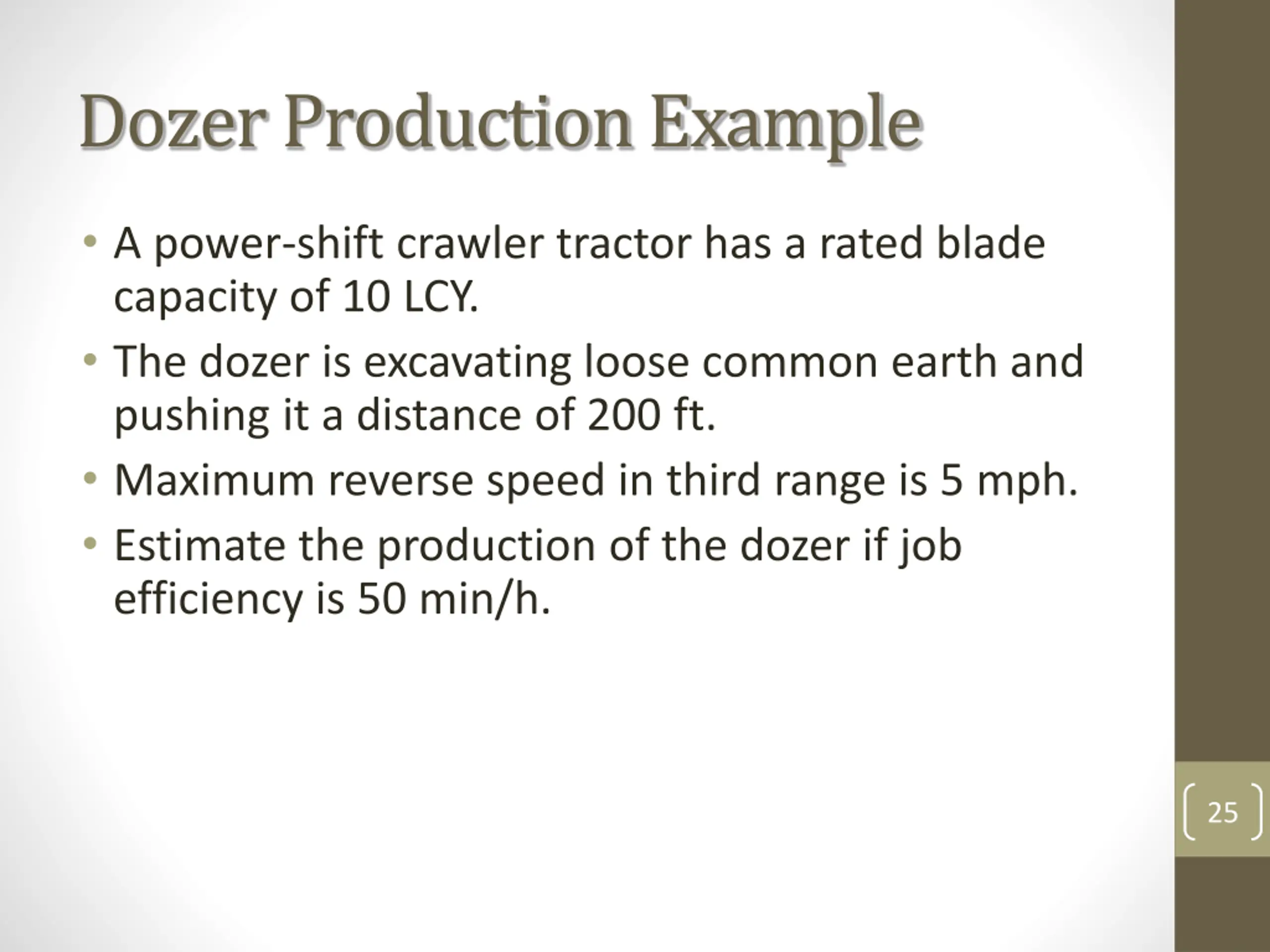 Dozer Production Example A power-shift crawler tractor has a rated blade capacity of 10 LCY. The dozer is excavating loose common earth and pushing it a distance of 200 ft. Maximum reverse speed in third range is 5 mph. Estimate the production of the dozer if job efficiency is 50 min/h. 25