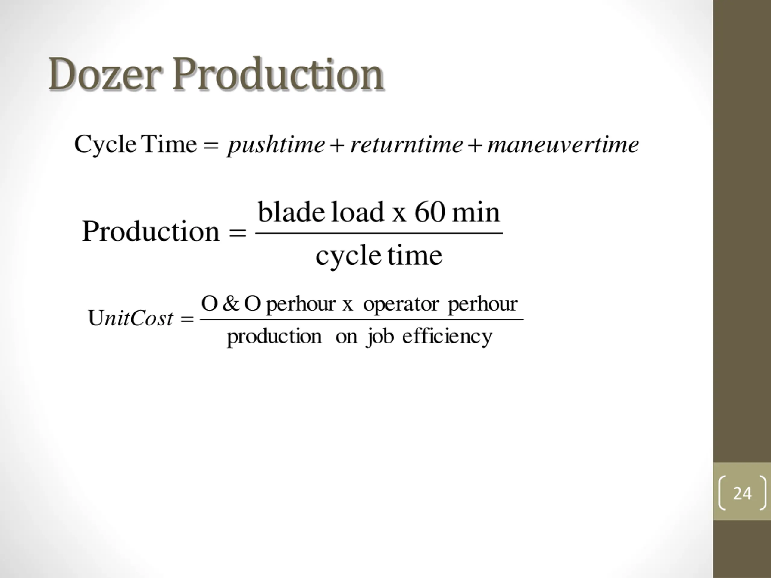 Dozer Production = + + Cycle Time pushtime returntime maneuverti me blade load x 60 min Production = cycle time O & perhour x O operator perhour = U nitCost production on job efficiency 24