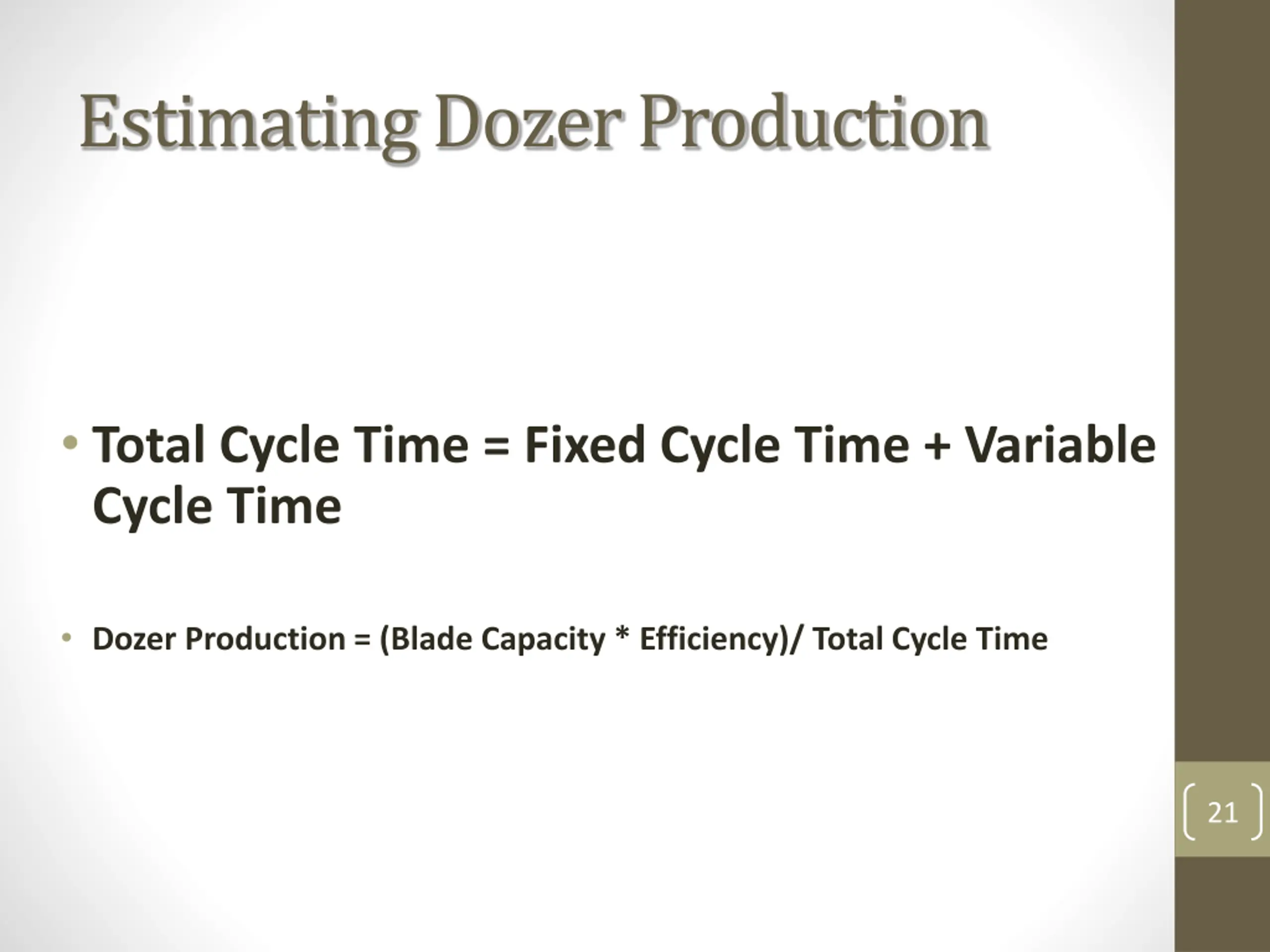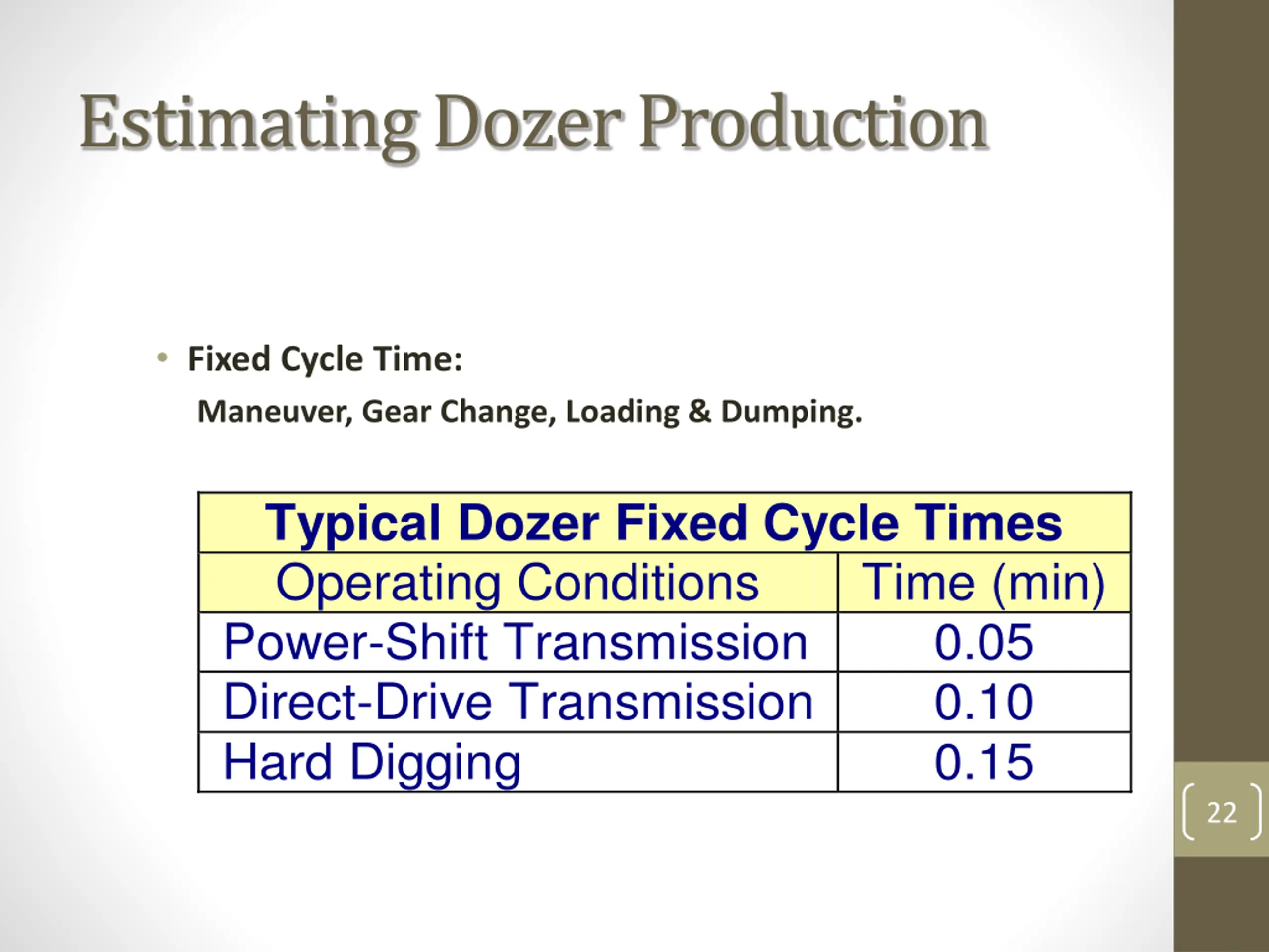 Estimating Dozer Production Fixed Cycle Time: Maneuver, Gear Change, Loading & Dumping. Typical Dozer Fixed Cycle Times Operating Conditions Power-Shift Transmission Direct-Drive Transmission Hard Digging Time (min) 0.05 0.10 0.15 22