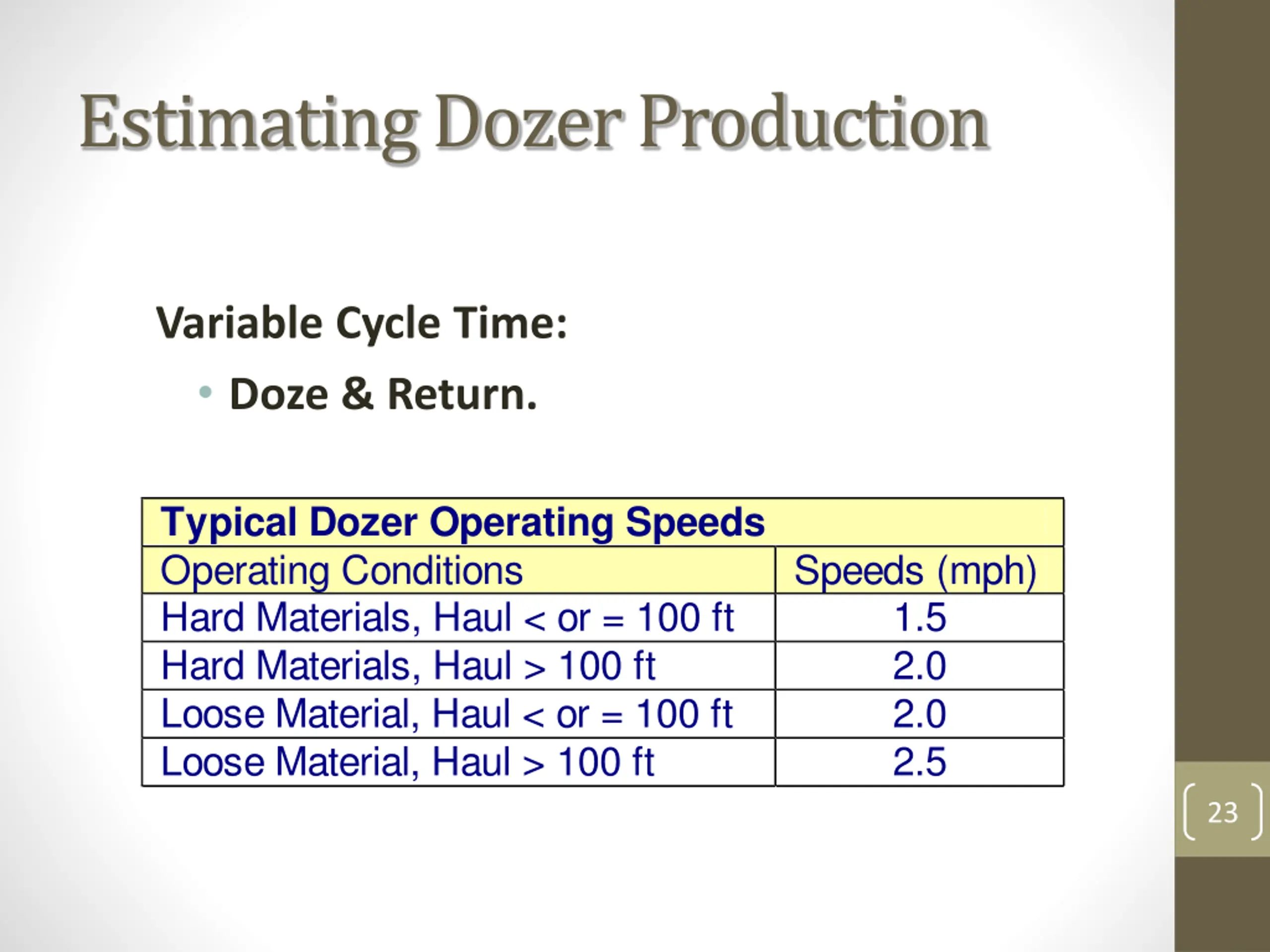 Estimating Dozer Production Variable Cycle Time: Doze & Return. Typical Dozer Operating Speeds Operating Conditions Hard Materials, Haul < or = 100 ft Hard Materials, Haul > 100 ft Loose Material, Haul < or = 100 ft Loose Material, Haul > 100 ft Speeds (mph) 1.5 2.0 2.0 2.5 23