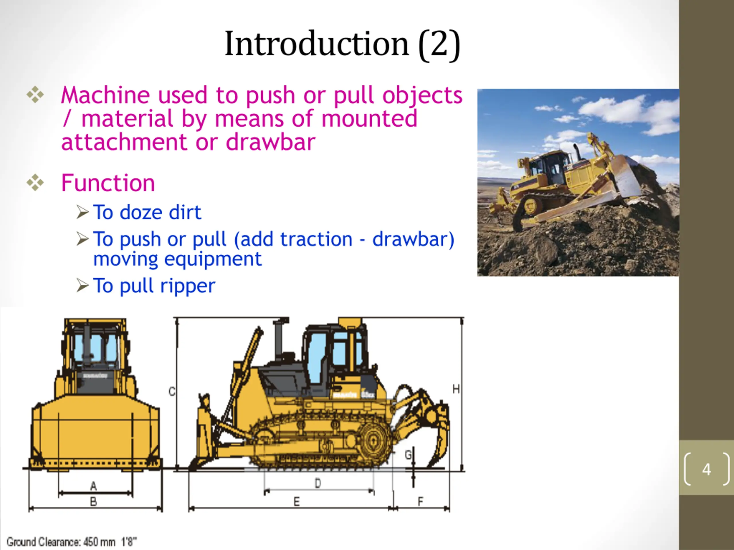 Introduction (2) Machine used to push or pull objects / material by means of mounted attachment or drawbar Function To doze dirt To push or pull (add traction - drawbar) moving equipment To pull ripper 4